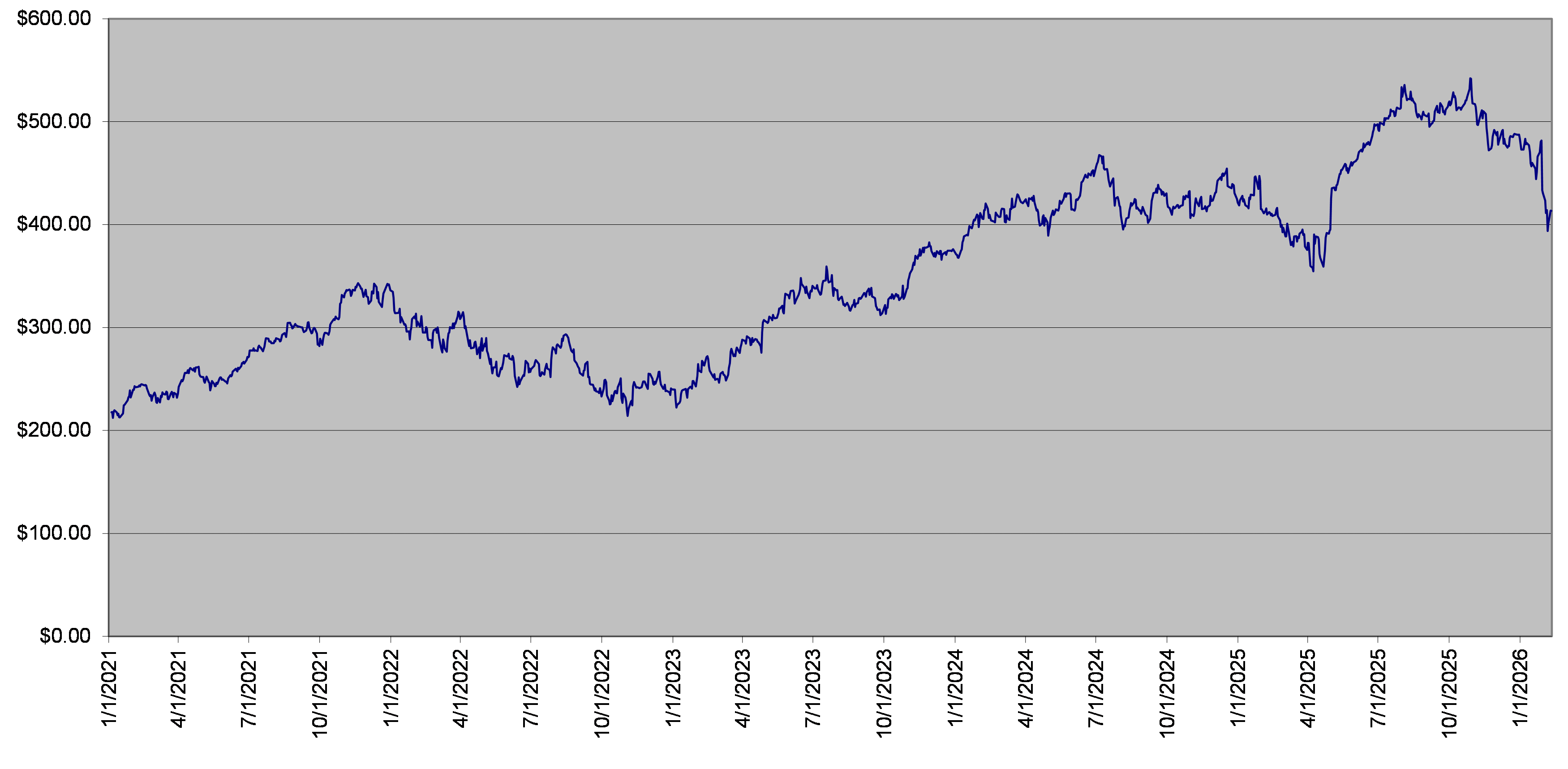 MSFT Stock Daily Closing Levels January 1, 2021 to February 10, 2026 |
