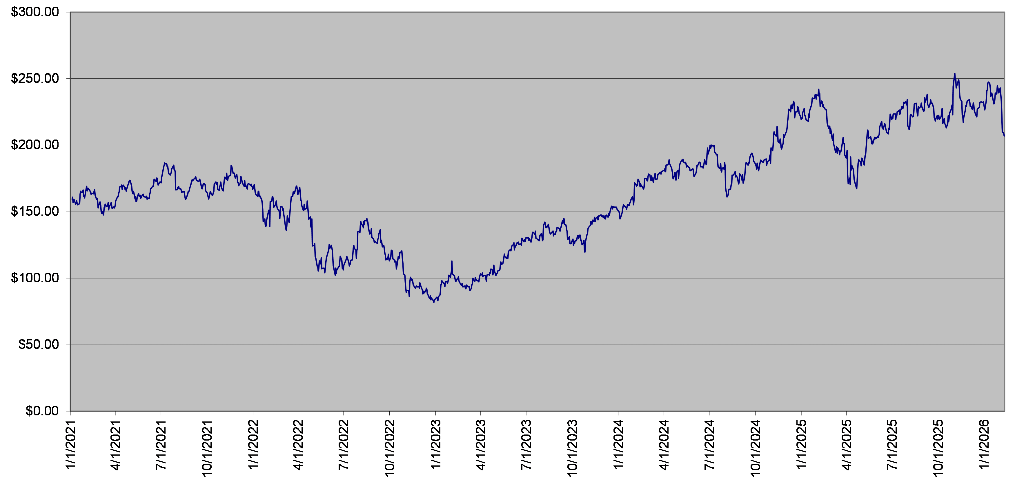 AMZN Stock Daily Closing Levels January 1, 2021 to February 10, 2026 |