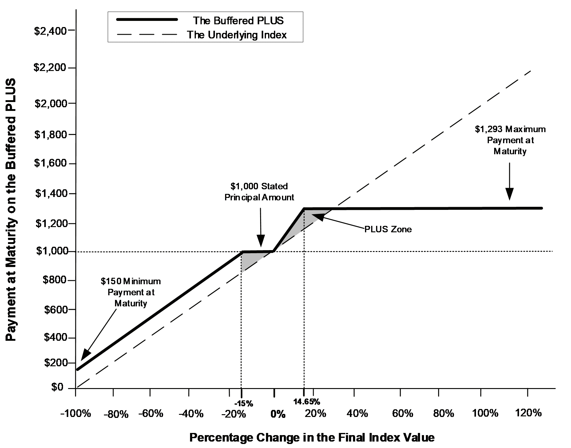 ■For example, if the underlying index depreciates 40%, investors would lose 25% of their principal and receive only $750 per Buffered PLUS at maturity, or 75% of the stated principal amount.