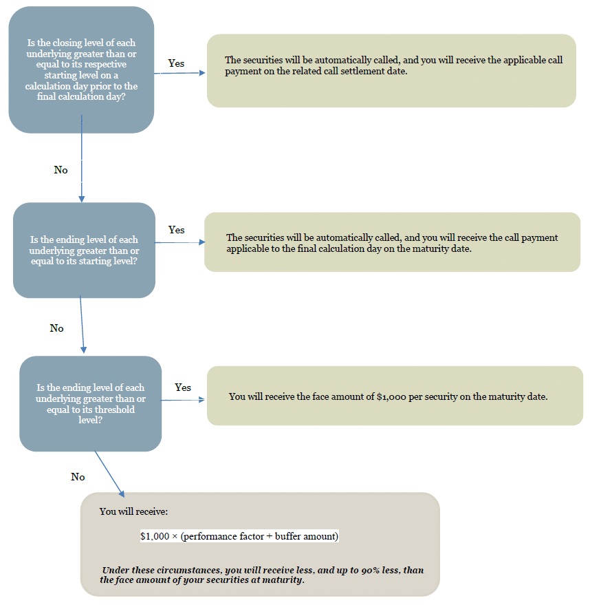 If the securities are not automatically called, you will be entitled to receive on the maturity date a cash payment per security as follows: If the ending level of either underlying is less than its respective starting level but the ending level of each underlying is greater than or equal to its threshold level: $1,000; or If the ending level of the lowest performing underlying is less than its threshold level: $1,000 × (performance factor of the lowest performing underlying + buffer amount) Under these circumstances, you will receive less, and up to 90% less, than the face amount of your securities at maturity. |