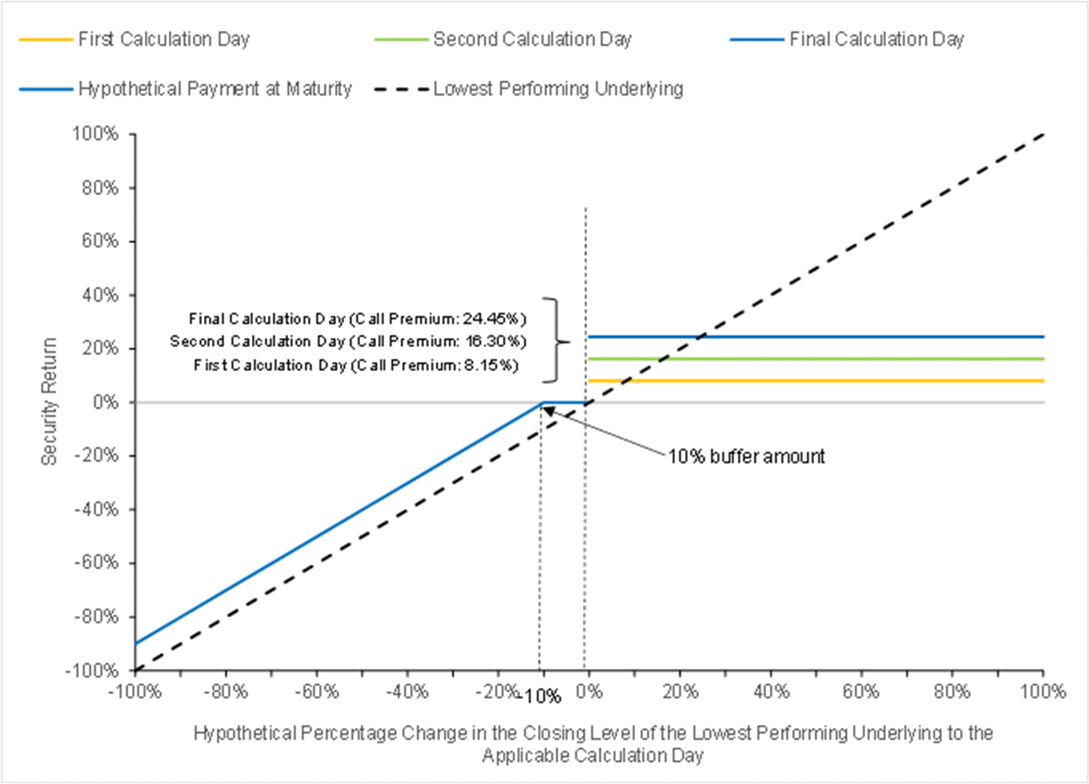 The hypothetical payout profile below illustrates the call payment or maturity payment amount on the securities, as applicable, for a range of hypothetical performances of the lowest performing underlying from its starting level to its closing level on the applicable calculation day.