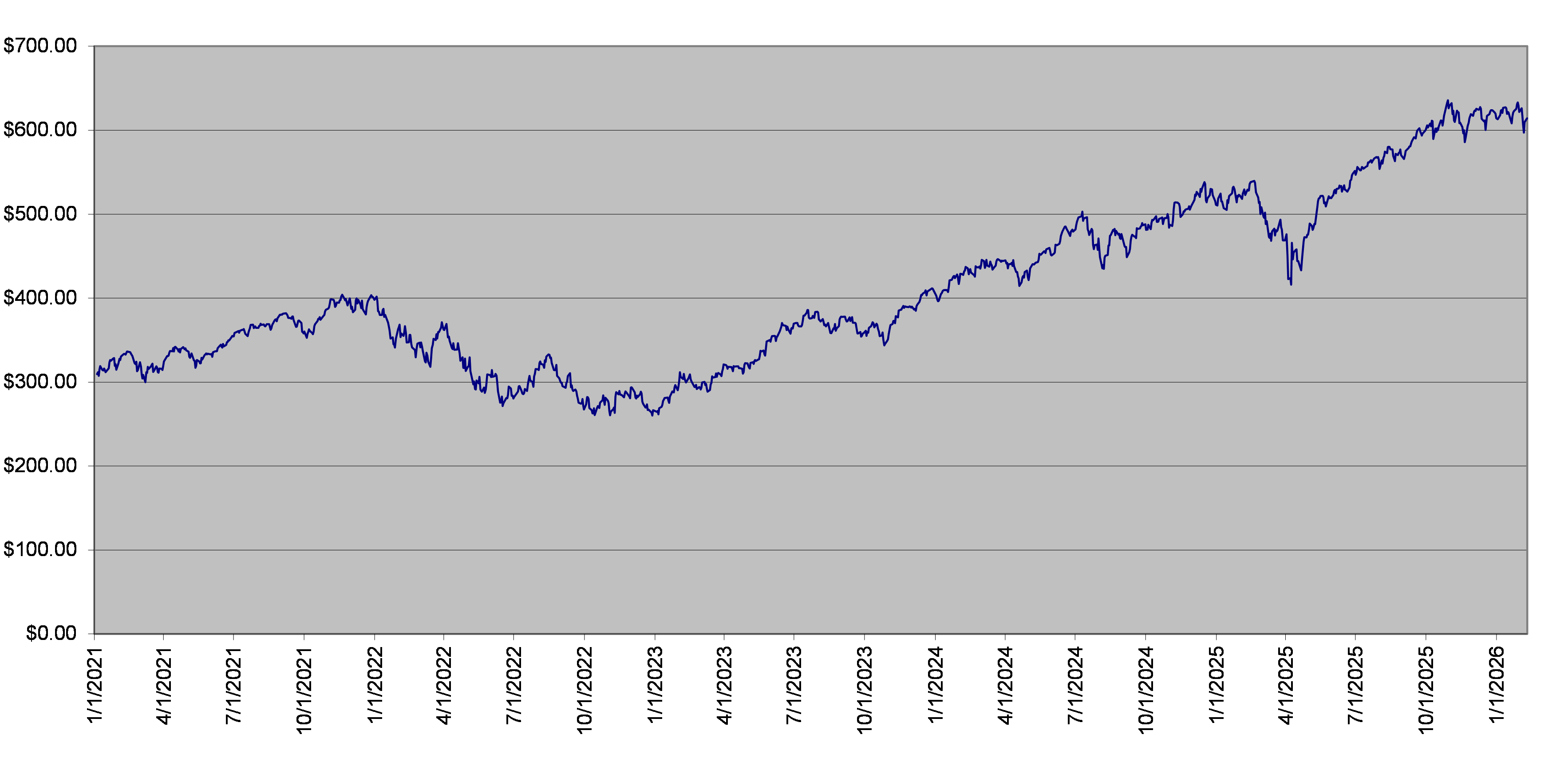QQQ Fund Daily Closing Levels January 1, 2021 to February 9, 2026 |