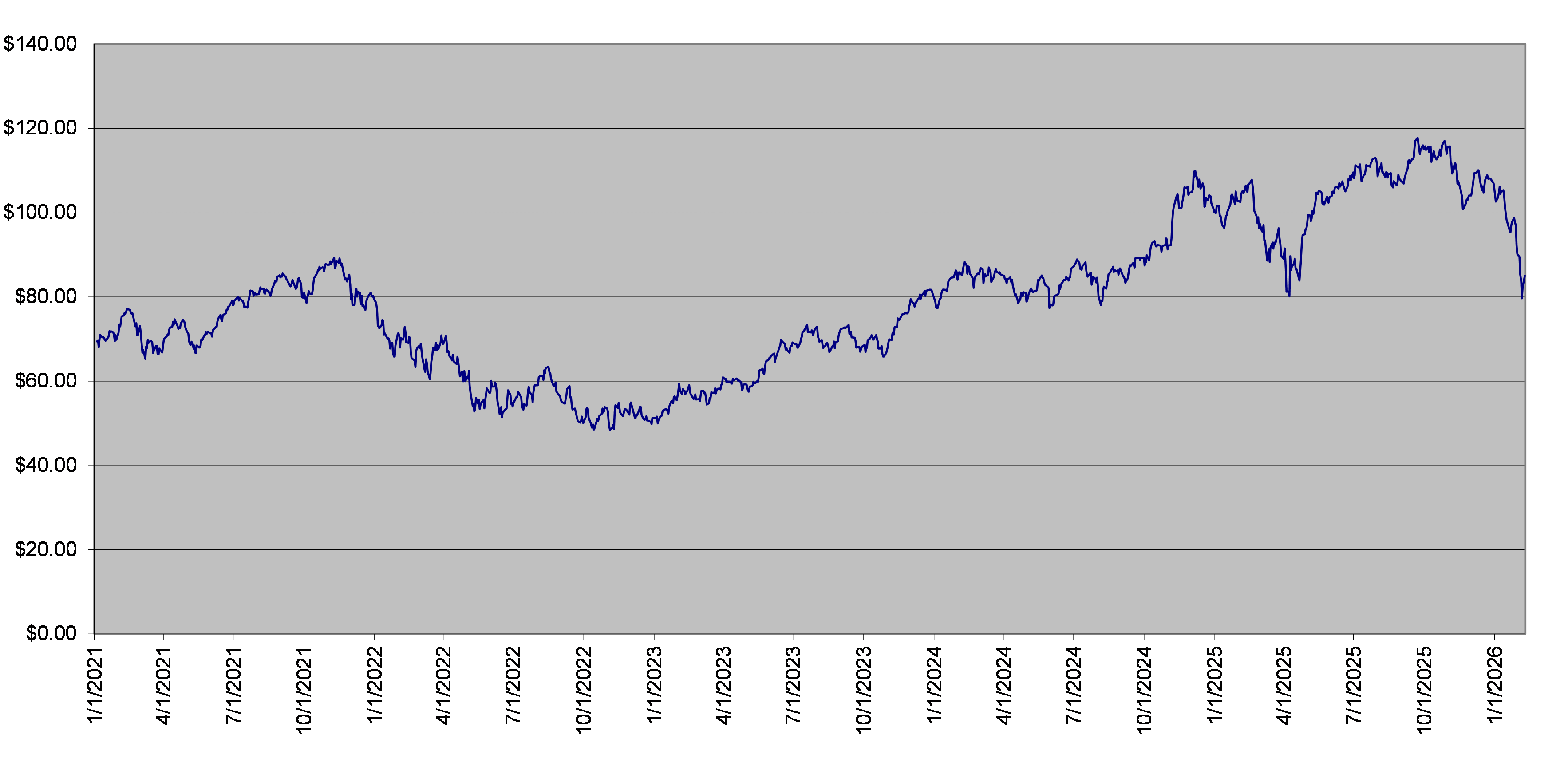 The closing level of the IGV Fund on February 9, 2026 was $85.03. The following graph sets forth the daily closing levels of the underlier for the period noted below. We obtained the historical information presented in this document from Bloomberg Financial Markets, without independent verification. The underlier has at times experienced periods of high volatility. You should not take the historical closing levels of the underlier as an indication of its future performance, and no assurance can be given as to the closing level of the underlier at any time.