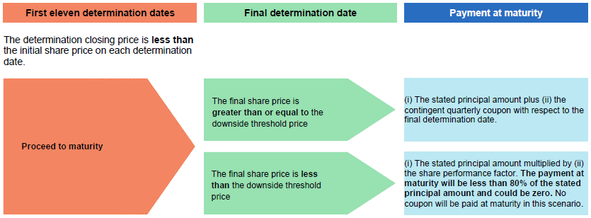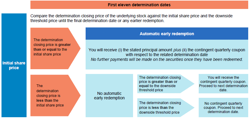 If, on any of the first eleven determination dates, the determination closing price of the underlying stock is greater than or equal to the initial share price, the securities will be automatically redeemed for an early redemption payment on the third business day following the related determination date. No further payments will be made on the securities once they have been redeemed. |