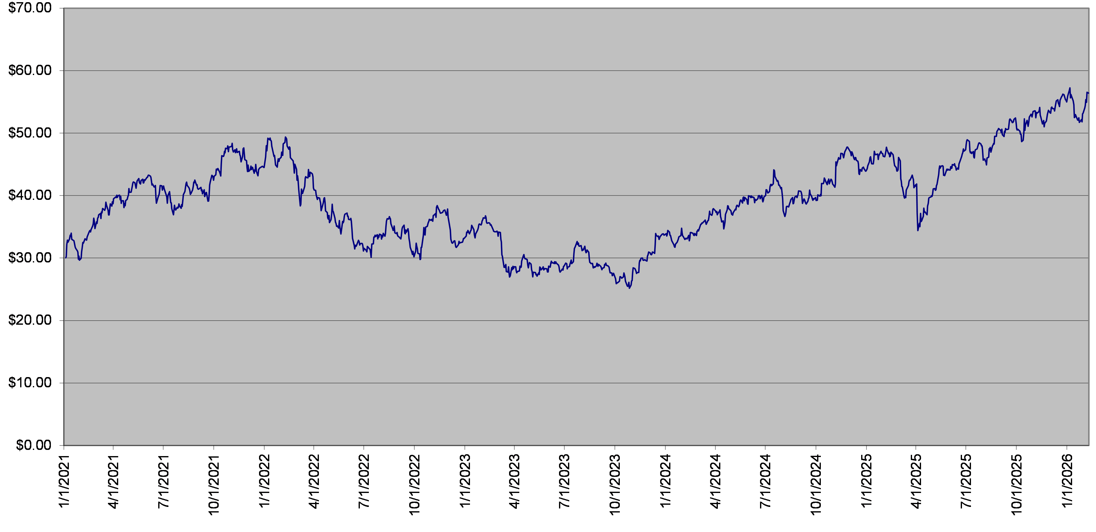 BAC Stock Daily Closing Levels January 1, 2021 to February 9, 2026 |