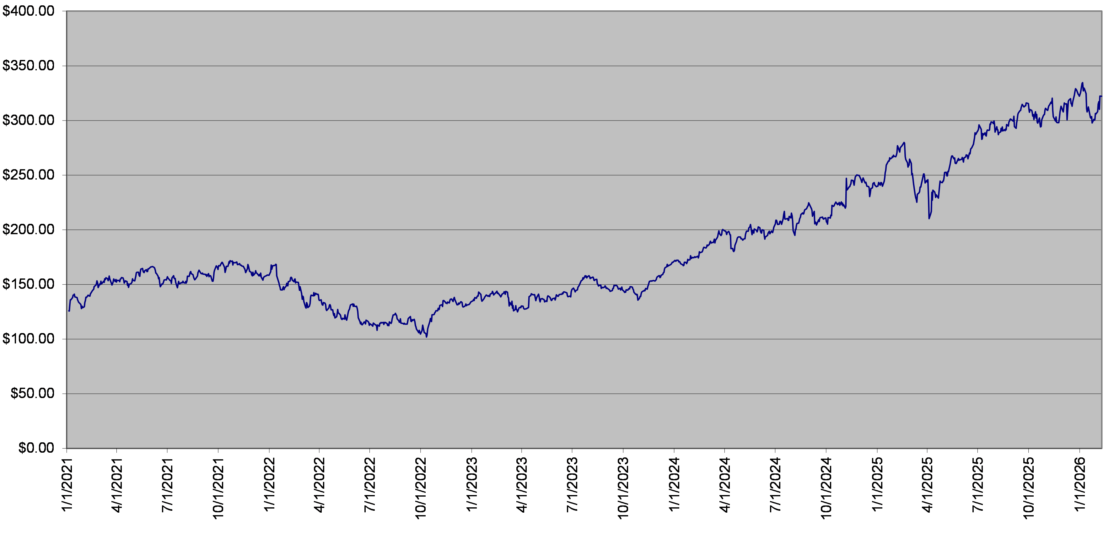JPM Stock Daily Closing Levels January 1, 2021 to February 9, 2026 |