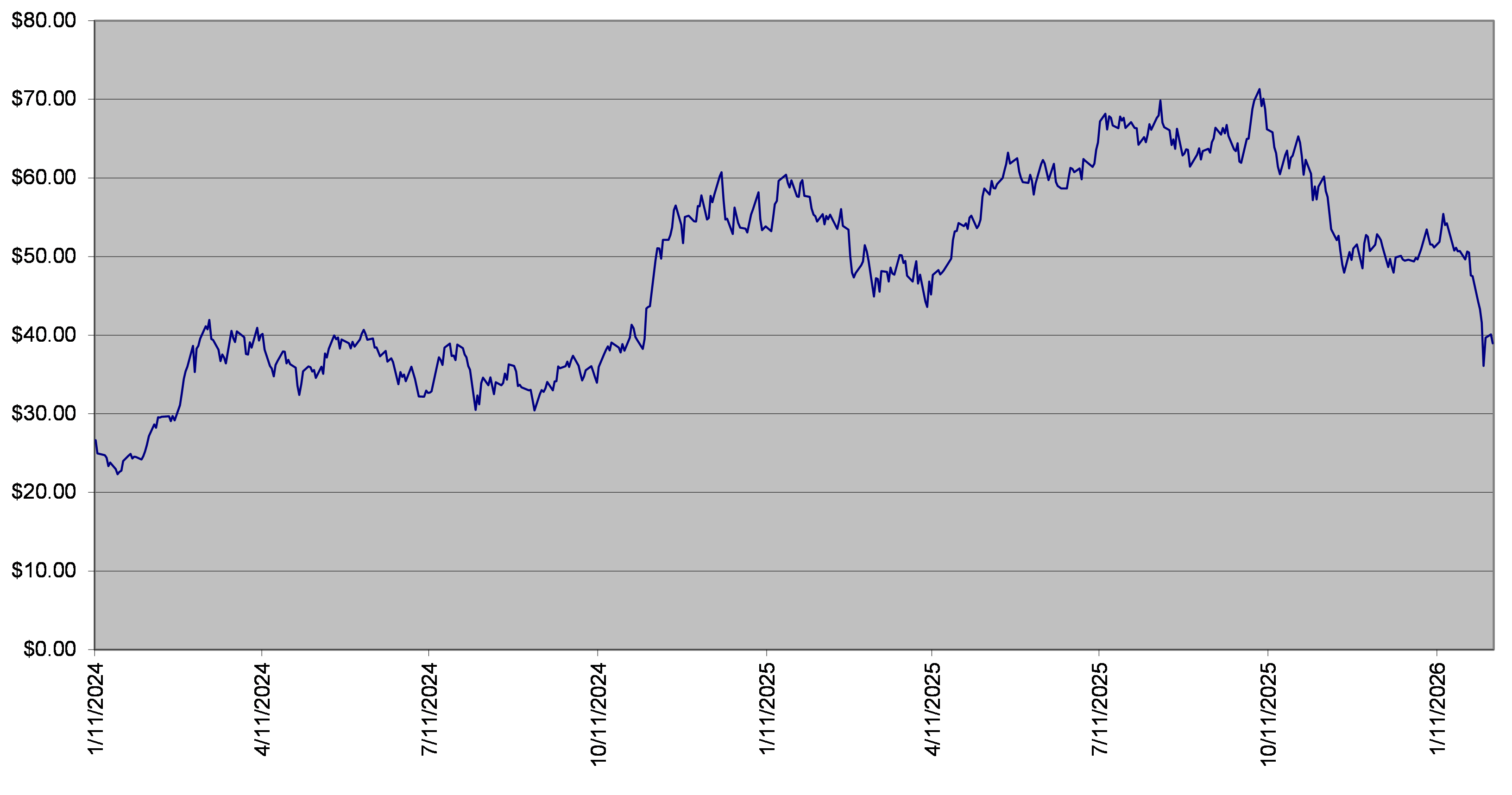 The closing price of the underlying shares on February 10, 2026 was $38.97. The following graph sets forth the daily closing prices of the underlying shares for the period noted below. We obtained the historical information presented in this document from Bloomberg Financial Markets, without independent verification. The underlying shares has at times experienced periods of high volatility. The historical performance of the underlying shares should not be taken as an indication of its future performance, and no assurance can be given as to the closing price of the underlying shares at any time.