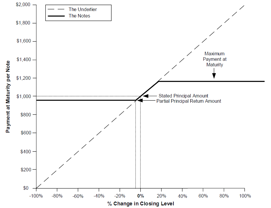 ■The notes may pay less than the stated principal amount, and may not pay more than the partial principal return amount. The notes provide for only the payment of a partial principal return amount, which is less than the stated principal amount, at maturity, and therefore do not guarantee the full return of principal at maturity. If the final level is less than the initial level, you will receive less than the stated principal amount at maturity.
