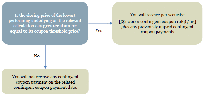 On each contingent coupon payment date, you will receive a contingent coupon payment at a per annum rate equal to the contingent coupon rate if, and only if, the closing price of the lowest performing underlying on the related calculation day is greater than or equal to its coupon threshold price. Each “contingent coupon payment”, if any, will be calculated per security as follows: ($1,000 × contingent coupon rate) / 12. Any contingent coupon payment will be rounded to the nearest cent, with one-half cent rounded upward. In addition, if the closing price of the lowest performing underlying on one or more calculation days is less than its coupon threshold price and, on a subsequent calculation day, the closing price of the lowest performing underlying is greater than or equal to its coupon threshold price, the securities will pay the contingent coupon payment due for the subsequent calculation day plus all previously unpaid contingent coupon payments (without interest accruing on amounts previously unpaid). If the closing price of the lowest performing underlying on any calculation day is less than its coupon threshold price, you will not receive any contingent coupon payment on the related contingent coupon payment date. In addition, if the closing price of the lowest performing underlying on a calculation day is less than its coupon threshold price and the closing price of the lowest performing underlying on each subsequent calculation day up to and including the final calculation day is less than its coupon threshold price, you will not receive any unpaid contingent coupon payment in respect of any of those calculation days. If the closing price of the lowest performing underlying is less than its coupon threshold price on all monthly calculation days, you will not receive any contingent coupon payments over the term of the securities. |
