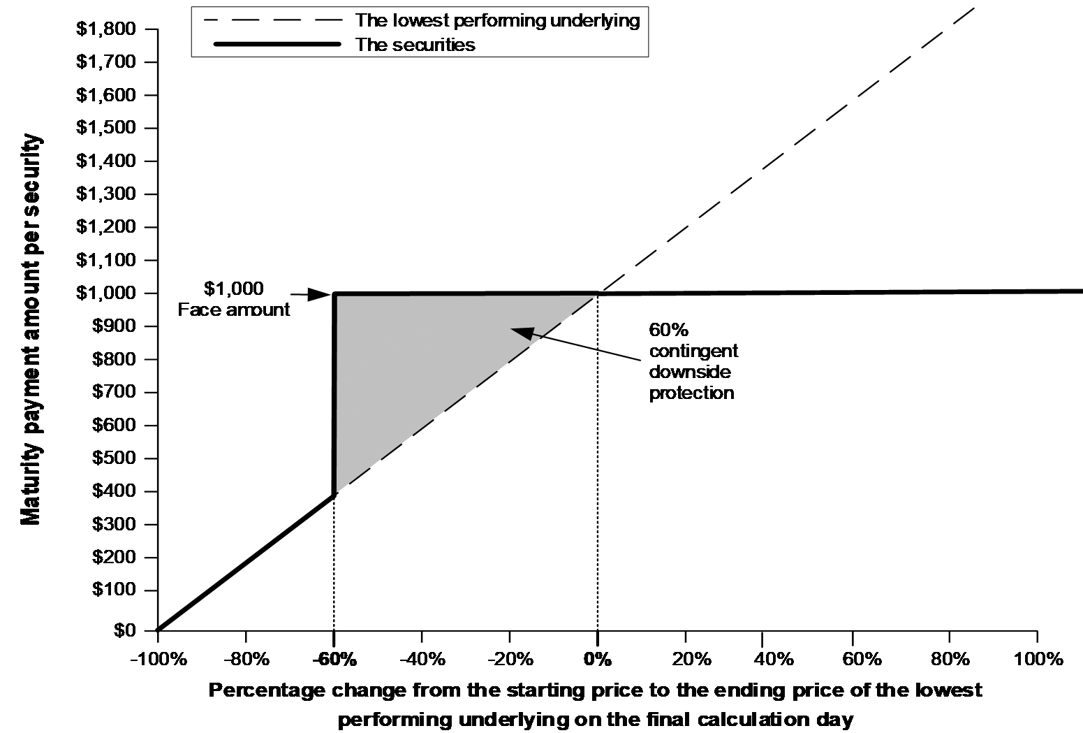 If the securities are not automatically called, you will be entitled to receive on the maturity date a cash payment per security equal to the maturity payment amount (in addition to the final contingent coupon payment due at maturity and any previously unpaid contingent coupon payments, if payable). The “maturity payment amount” per security will equal: ●if the ending price of each underlying is greater than or equal to its respective downside threshold price: $1,000; or ●if the ending price of any underlying is less than its respective downside threshold price: $1,000 × performance factor of the lowest performing underlying on the final calculation day If the securities are not automatically called prior to maturity and the ending price of the lowest performing underlying is less than its downside threshold price, you will receive significantly less than the face amount of your securities and you will not receive any contingent coupon payment at maturity (including any previously unpaid contingent coupon payments). Under these circumstances, you will lose more than 60%, and possibly all, of your investment. |