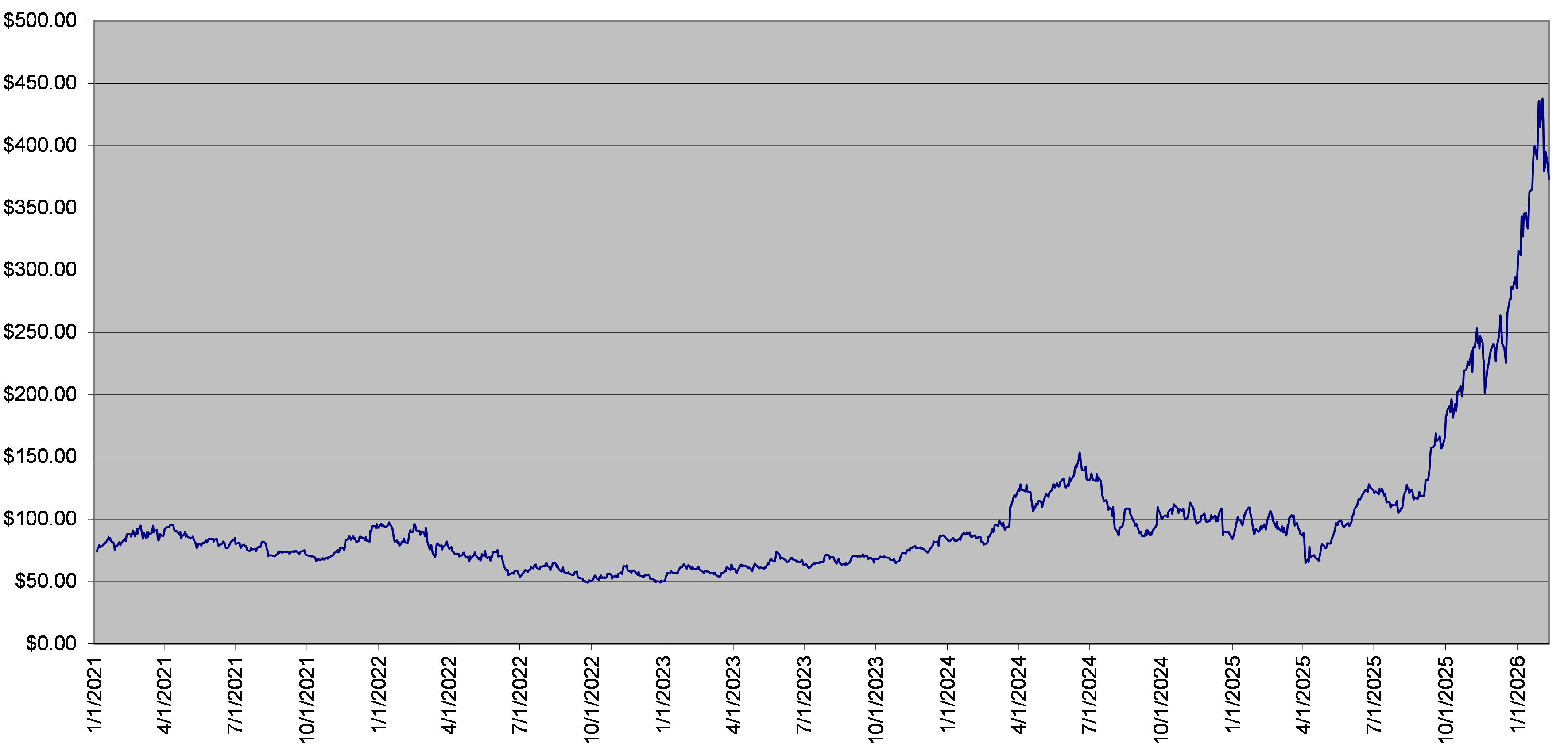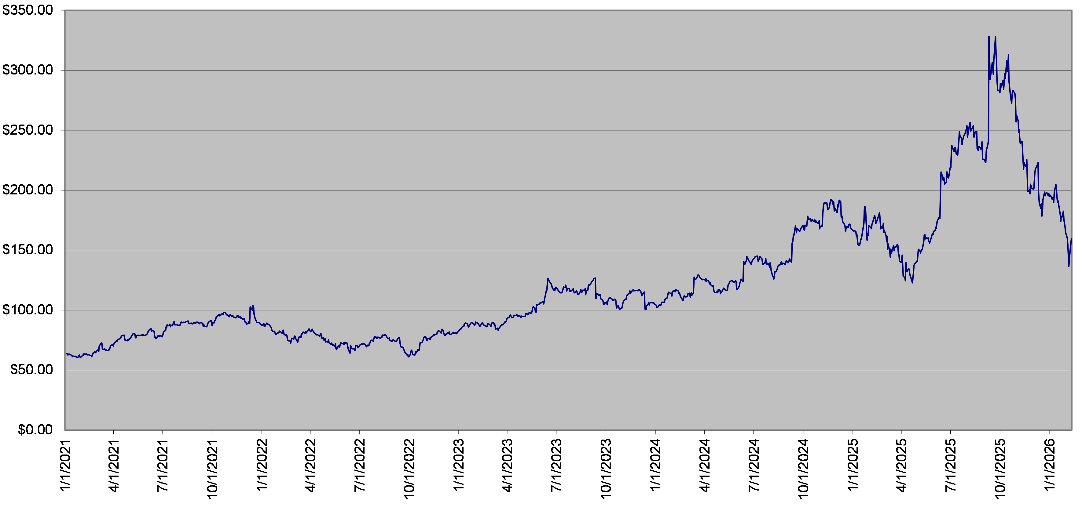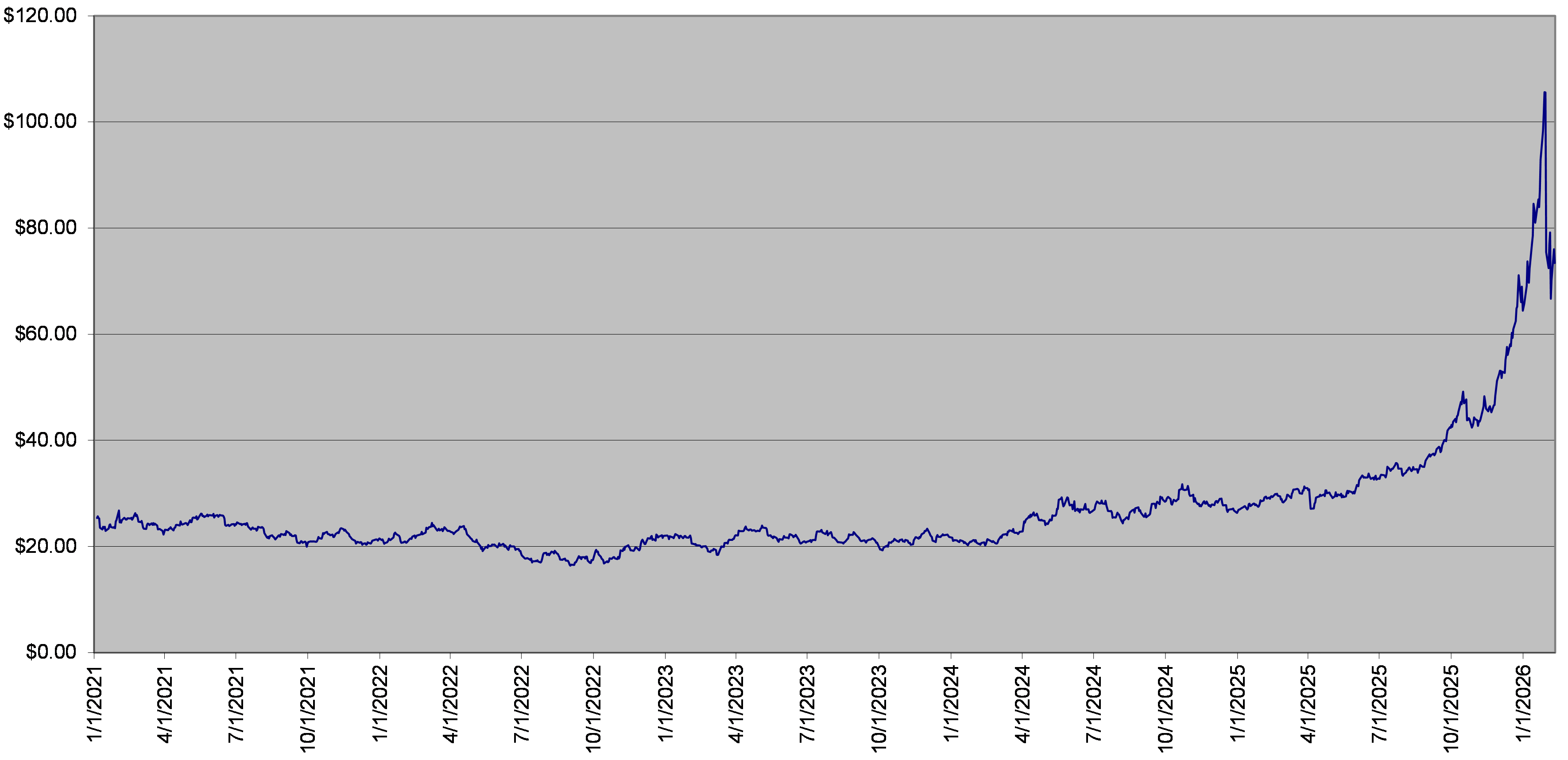 iShares® Silver Trust - Daily Closing Prices January 1, 2021 to February 10, 2026 |