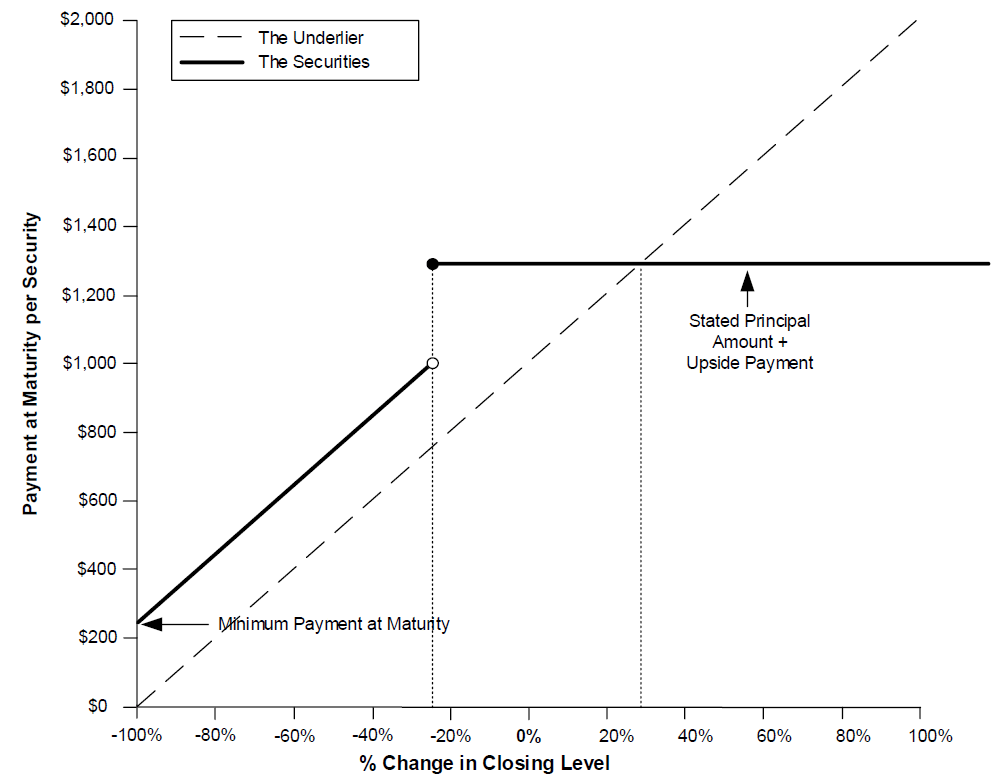 ■Payment at maturity. At maturity, if the final level is greater than or equal to the buffer level, investors will receive the stated principal amount plus the upside payment specified herein. If, however, the final level is less than the buffer level, investors will lose 1% for every 1% decline in the level of the underlier beyond the specified buffer amount. Under these circumstances, the payment at maturity will be less, and may be significantly less, than the stated principal amount of the securities, subject to the minimum payment at maturity.