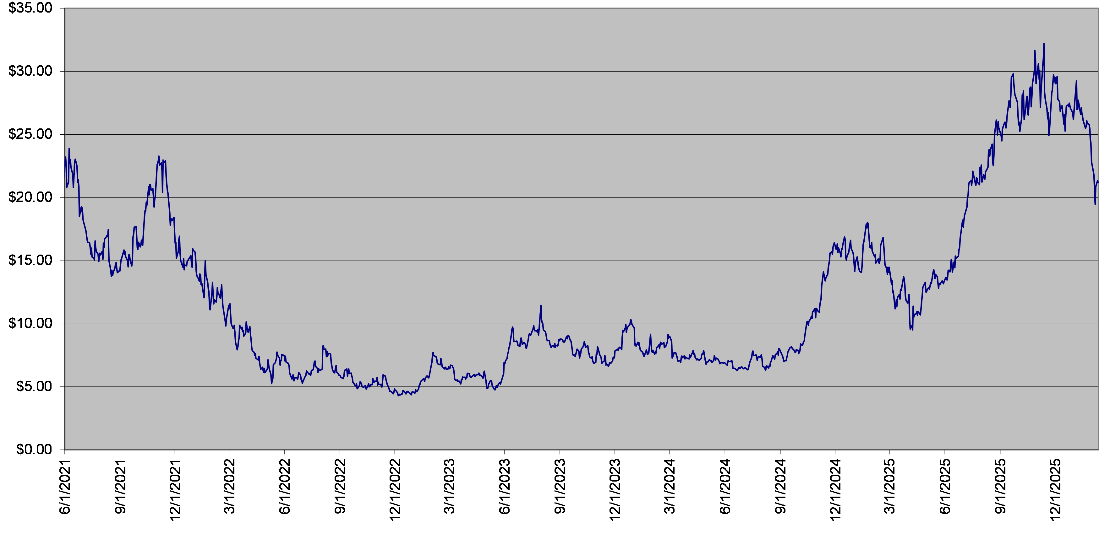 The closing level of the underlier on February 10, 2026 was $21.18. The following graph sets forth the daily closing levels of the underlier for the period noted below. We obtained the historical information presented in this document from Bloomberg Financial Markets, without independent verification. The underlier has at times experienced periods of high volatility. You should not take the historical closing levels of the underlier as an indication of its future performance, and no assurance can be given as to the closing level of the underlier at any time.