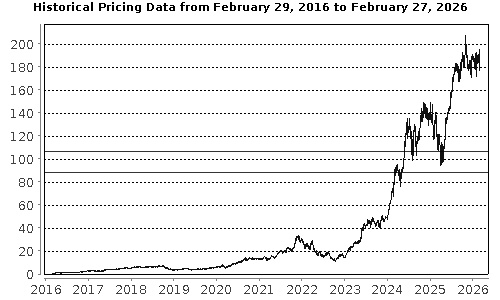 The graph below illustrates the performance of NVIDIA's common stock for the period indicated, based on the daily closing levels as reported by Bloomberg, without independent verification. UBS has not conducted any independent review or due diligence of any publicly available information obtained from Bloomberg. The solid lines represent its coupon barrier and downside threshold of $106.31 and $88.60, which are equal to 60.00% and 50.00%, respectively of the closing level on February 27, 2026. Past performance of the underlying asset is not indicative of the future performance of the underlying asset during the term of the Notes. |
