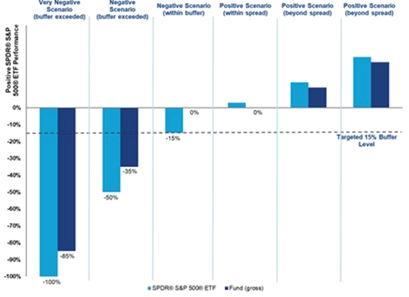 | • | Buffer: The Fund seeks to provide a downside loss buffer against the first 15.00% of Underlying ETF losses prior to taking into account any fees or expenses charged to the Fund. When the Fund’s annualized management fee of 0.74% of the Fund’s average daily net assets is taken into account, the buffer is reduced to 14.26%. The Fund is expected to experience all subsequent losses experienced by the Underlying ETF’s share price once the Buffer has been exhausted. |