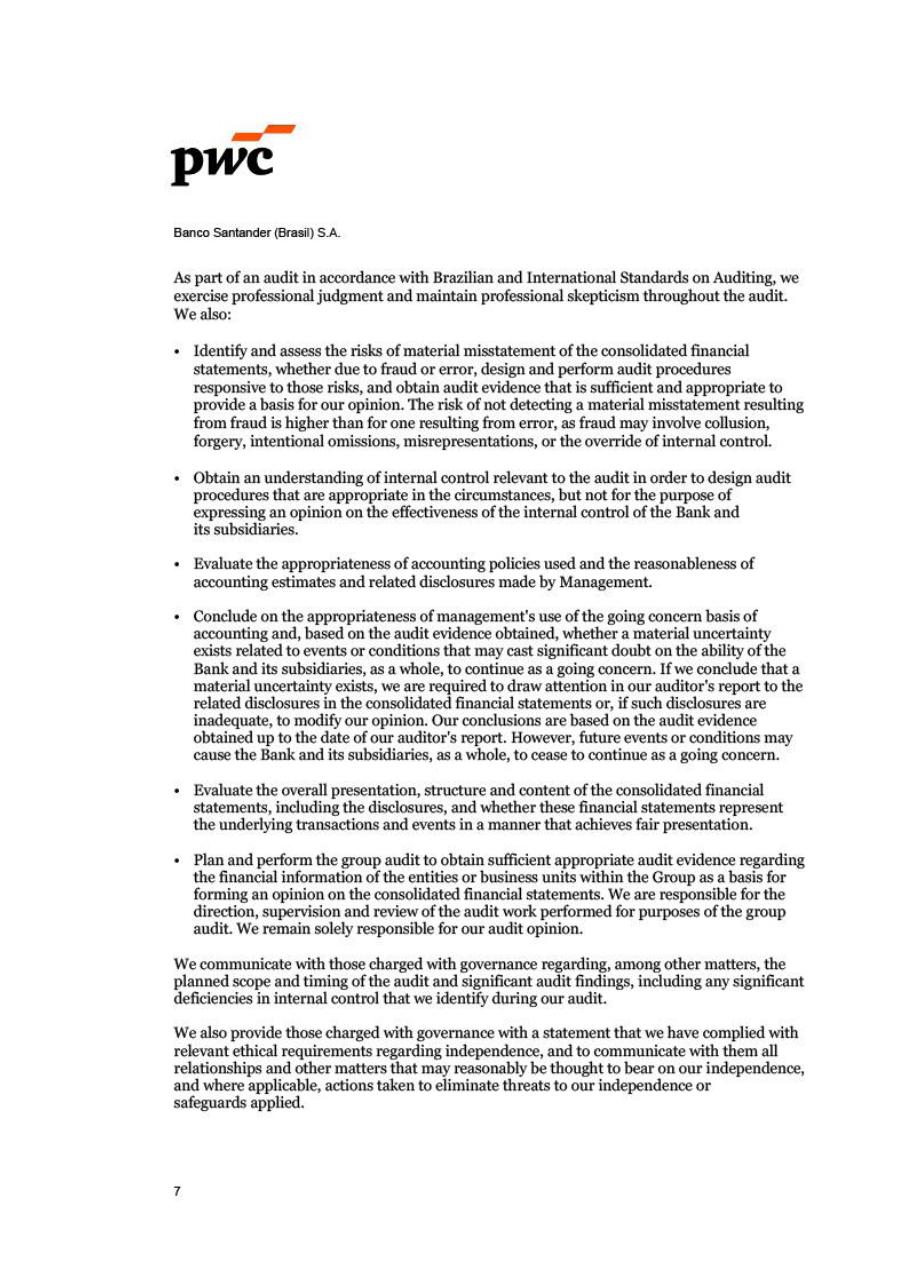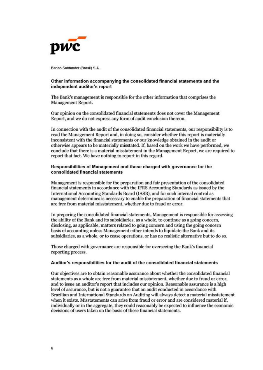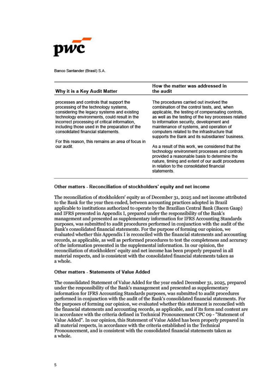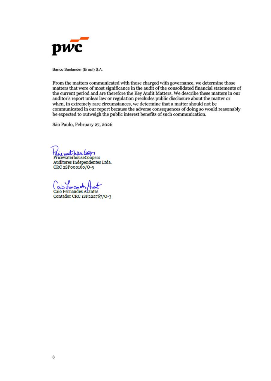 Pursuant to the provisions of article 27, § 1, item VI, of the Brazilian Securities and Exchange Commission (CVM) Instruction No. 80, dated March 29, 2022, the members of the Executive Board of Banco Santander (Brasil) S.A. (Banco Santander) hereby declare that they have discussed, reviewed, and concurred with the opinions expressed in the report of independent auditors about the Financial Statements of Banco Santander for the fiscal year ended on December 31, 2025. These Statements have been prepared in accordance with the International Financial Reporting Standards (IFRS®) and include the Management Report, Consolidated Balance Sheet, Consolidated Statement of Income, Consolidated Statement of Comprehensive Income, Statement of Changes in Shareholders' Equity, Statement of Cash Flows, Statement of Value Added, and Notes to the Financial Statements, all of which have been prepared in accordance with the accounting standards adopted in Brazil, as per Law No. 6.404, dated December 14, 1976 (Brazilian Corporation Law), and the international financial reporting standards issued by the International Accounting Standards Board (IASB).