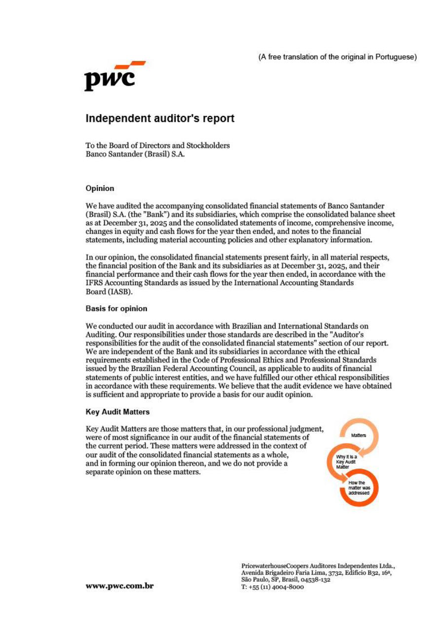 We present the Management Report for the Consolidated Financial Statements of Banco Santander (Brasil) S.A. (Banco Santander or Bank) for the fiscal year ended on December 31, 2025. These statements have been prepared in conformity with the International Financial Reporting Standards (IFRS®) issued by the International Accounting Standards Board (IASB®), (currently referred to by the IFRS® Foundation as “standards accounting IFRS®”) and the interpretations of the IFRS Interpretations Committee (formerly the International Financial Reporting Interpretations Committee - IFRIC®). They will be published on the website www.santander.com.br/ri.