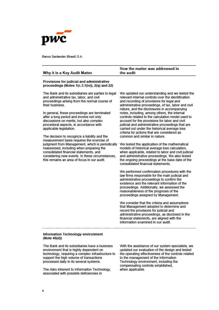 Regarding the Independent Audit work performed by PricewaterhouseCoopers Auditores Independentes ("PwC"), the Audit Committee met formally on several occasions in the second half of 2025. At these meetings the following topics were highlighted: discussions involving the financial statements for the second semester ended December 31st, 2025, accounting practices, the main audit matters (“PAAs”) and eventual deficiencies and recommendations raised in the internal control report and detailed report on the revision of “Allowance for Loan Losses”. In addition, the Committee met with the Independent Auditor in executive sessions to discuss topics of interest, such as the Brazilian Tax Reform. The Audit Committee evaluated the proposals submitted by PwC for the performance of other services, in order to verify the absence of conflicts of interest or potential risk of loss of independence. The Committee also met with KPMG Auditores Independentes (“KPMG”), responsible for the audit of Banco RCI Brasil S.A., member of the Conglomerate.