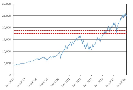 The graph below illustrates the performance of NDX from January 1, 2016 through February 27, 2026, based on the daily closing levels as reported by Bloomberg, without independent verification. UBS has not conducted any independent review or due diligence of any publicly available information obtained from Bloomberg. The closing level of NDX on February 27, 2026 was 24,960.04. The dotted lines represent its coupon barrier of 18,720.03, which is equal to 75.00% of its initial level, and its downside threshold of 17,472.03, which is equal to 70.00% of its initial level. Past performance of the underlying asset is not indicative of the future performance of the underlying asset during the term of the Notes.