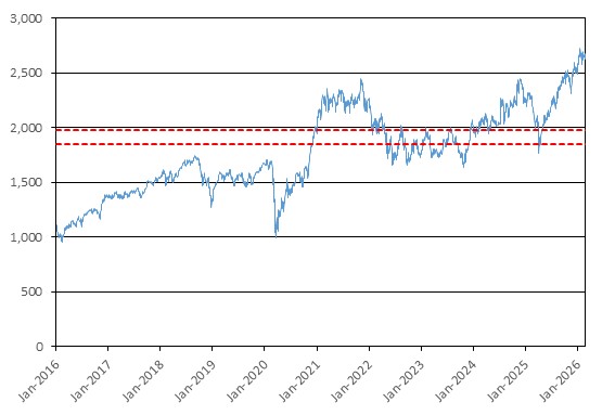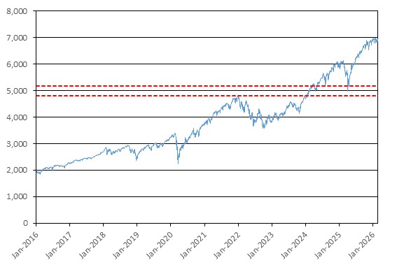 The graph below illustrates the performance of SPX from January 1, 2016 through February 27, 2026, based on the daily closing levels as reported by Bloomberg, without independent verification. UBS has not conducted any independent review or due diligence of any publicly available information obtained from Bloomberg. The closing level of SPX on February 27, 2026 was 6,878.88. The dotted lines represent its coupon barrier of 5,159.16, which is equal to 75.00% of its initial level, and its downside threshold of 4,815.22, which is equal to 70.00% of its initial level. Past performance of the underlying asset is not indicative of the future performance of the underlying asset during the term of the Notes.