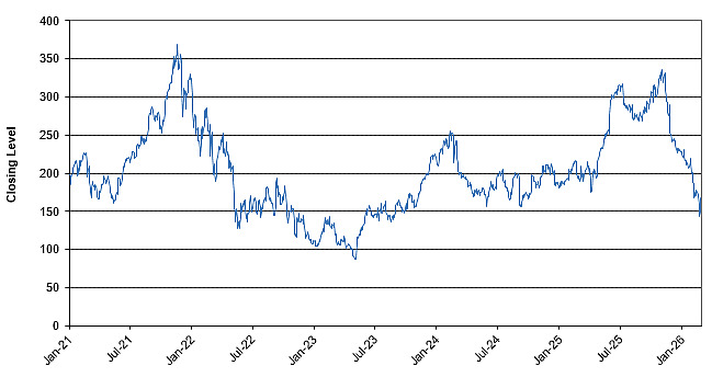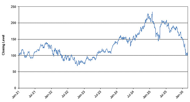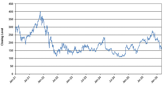 The graph below sets forth the historical performance of the SNOW Underlier based on the daily Closing Values from January 4, 2021 through February 26, 2026. We obtained the Closing Values shown in the graph below from Bloomberg. We have not independently verified the accuracy or completeness of the information obtained from Bloomberg. The Closing Values below may reflect adjustments in response to certain corporate actions, such as stock splits, public offerings, mergers and acquisitions, spin-offs, extraordinary dividends, delistings and bankruptcy.