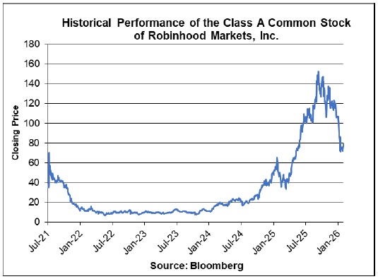 The following graph sets forth daily closing prices of the Class A common stock of Robinhood Markets, Inc. for the period from January 4, 2021 to February 26, 2026. The closing price on February 26, 2026 was $79.45. The historical performance of the Class A common stock of Robinhood Markets, Inc. should not be taken as an indication of its future performance during the term of the securities.