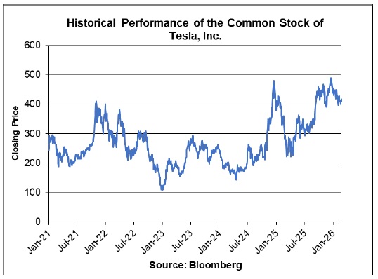 The following graph sets forth daily closing prices of the common stock of Tesla, Inc. for the period from January 4, 2021 to February 26, 2026. The closing price on February 26, 2026 was $408.58. The historical performance of the common stock of Tesla, Inc. should not be taken as an indication of its future performance during the term of the securities.
