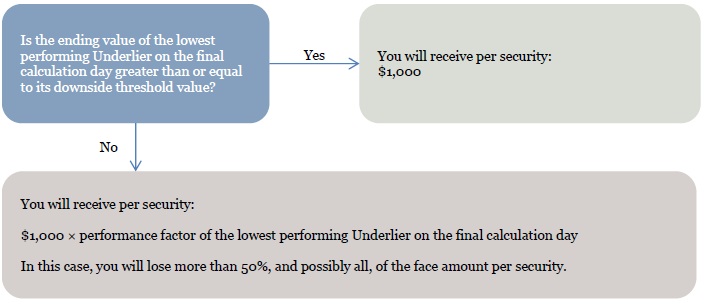 • if the ending value of the lowest performing Underlier on the final calculation day is less than its downside threshold value: