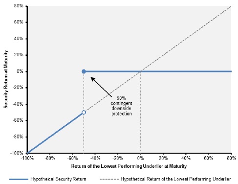 Since the hypothetical ending value of the lowest performing Underlier on the final calculation day is less than its hypothetical starting value, but not by more than 50%, you would receive the face amount of your securities at maturity.