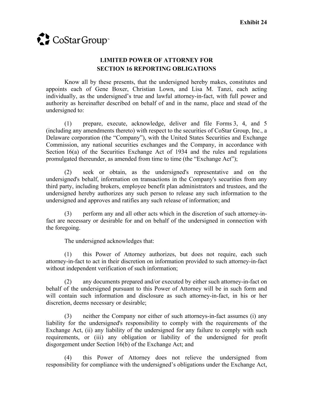 Exhibit 24 LIMITED POWER OF ATTORNEY FOR SECTION 16 REPORTING OBLIGATIONS Know all by these presents, that the undersigned hereby makes, constitutes and appoints each of Gene Boxer, Christian Lown, and Lisa M. Tanzi, each acting individually, as the undersigned’s true and lawful attorney-in-fact, with full power and authority as hereinafter described on behalf of and in the name, place and stead of the undersigned to: (1) prepare, execute, acknowledge, deliver and file Forms 3, 4, and 5 (including any amendments thereto) with respect to the securities of CoStar Group, Inc., a Delaware corporation (the “Company”), with the United States Securities and Exchange Commission, any national securities exchanges and the Company, in accordance with Section 16(a) of the Securities Exchange Act of 1934 and the rules and regulations promulgated thereunder, as amended from time to time (the “Exchange Act”); (2) seek or obtain, as the undersigned's representative and on the undersigned's behalf, information on transactions in the Company's securities from any third party, including brokers, employee benefit plan administrators and trustees, and the undersigned hereby authorizes any such person to release any such information to the undersigned and approves and ratifies any such release of information; and (3) perform any and all other acts which in the discretion of such attorney-in- fact are necessary or desirable for and on behalf of the undersigned in connection with the foregoing. The undersigned acknowledges that: (1) this Power of Attorney authorizes, but does not require, each such attorney-in-fact to act in their discretion on information provided to such attorney-in-fact without independent verification of such information; (2) any documents prepared and/or executed by either such attorney-in-fact on behalf of the undersigned pursuant to this Power of Attorney will be in such form and will contain such information and disclosure as such attorney-in-fact, in his or her discretion, deems necessary or desirable; (3) neither the Company nor either of such attorneys-in-fact assumes (i) any liability for the undersigned's responsibility to comply with the requirements of the Exchange Act, (ii) any liability of the undersigned for any failure to comply with such requirements, or (iii) any obligation or liability of the undersigned for profit disgorgement under Section 16(b) of the Exchange Act; and (4) this Power of Attorney does not relieve the undersigned from responsibility for compliance with the undersigned’s obligations under the Exchange Act,