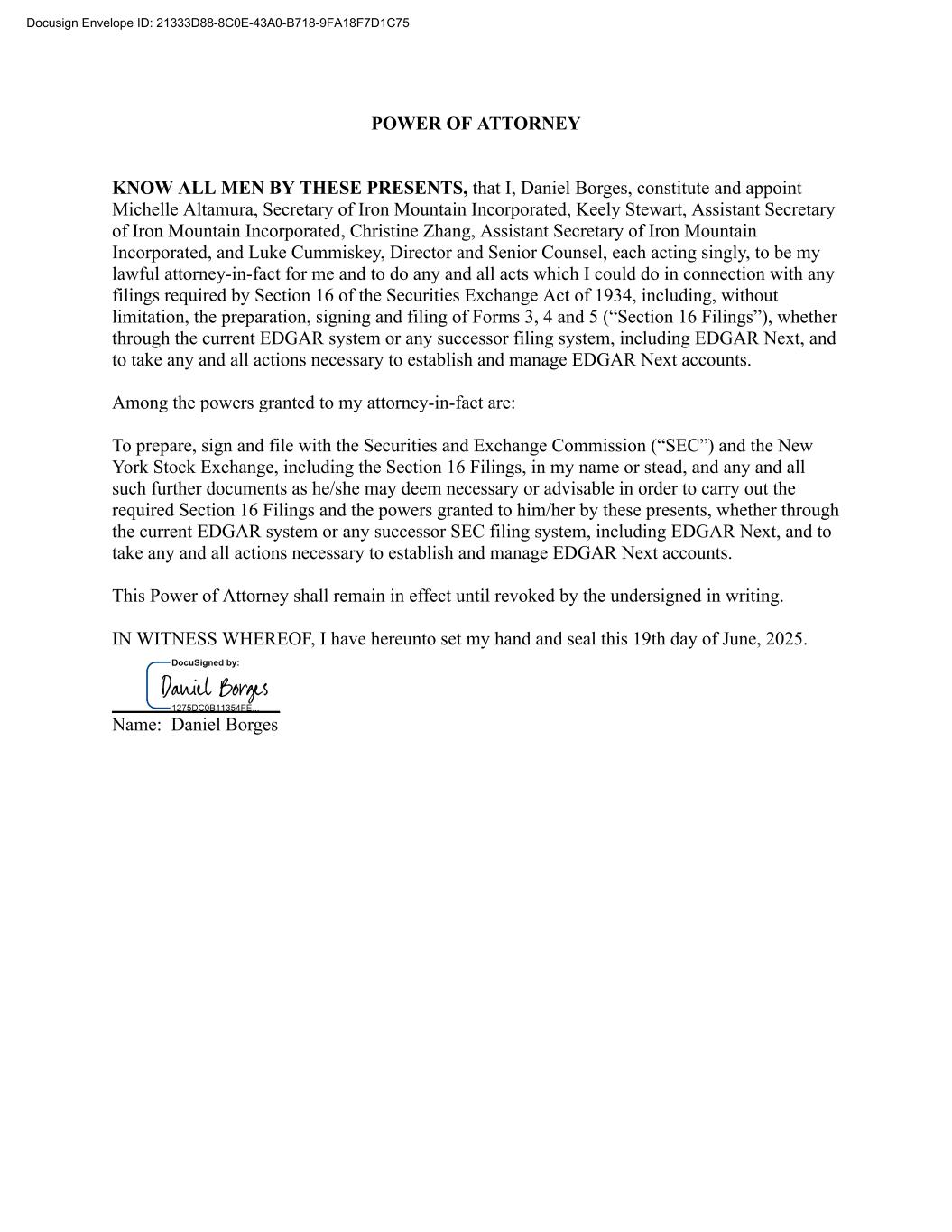 POWER OF ATTORNEY KNOW ALL MEN BY THESE PRESENTS, that I, Daniel Borges, constitute and appoint Michelle Altamura, Secretary of Iron Mountain Incorporated, Keely Stewart, Assistant Secretary of Iron Mountain Incorporated, Christine Zhang, Assistant Secretary of Iron Mountain Incorporated, and Luke Cummiskey, Director and Senior Counsel, each acting singly, to be my lawful attorney-in-fact for me and to do any and all acts which I could do in connection with any filings required by Section 16 of the Securities Exchange Act of 1934, including, without limitation, the preparation, signing and filing of Forms 3, 4 and 5 (“Section 16 Filings”), whether through the current EDGAR system or any successor filing system, including EDGAR Next, and to take any and all actions necessary to establish and manage EDGAR Next accounts. Among the powers granted to my attorney-in-fact are: To prepare, sign and file with the Securities and Exchange Commission (“SEC”) and the New York Stock Exchange, including the Section 16 Filings, in my name or stead, and any and all such further documents as he/she may deem necessary or advisable in order to carry out the required Section 16 Filings and the powers granted to him/her by these presents, whether through the current EDGAR system or any successor SEC filing system, including EDGAR Next, and to take any and all actions necessary to establish and manage EDGAR Next accounts. This Power of Attorney shall remain in effect until revoked by the undersigned in writing. IN WITNESS WHEREOF, I have hereunto set my hand and seal this 19th day of June, 2025. __________________ Name: Daniel Borges Docusign Envelope ID: 21333D88-8C0E-43A0-B718-9FA18F7D1C75