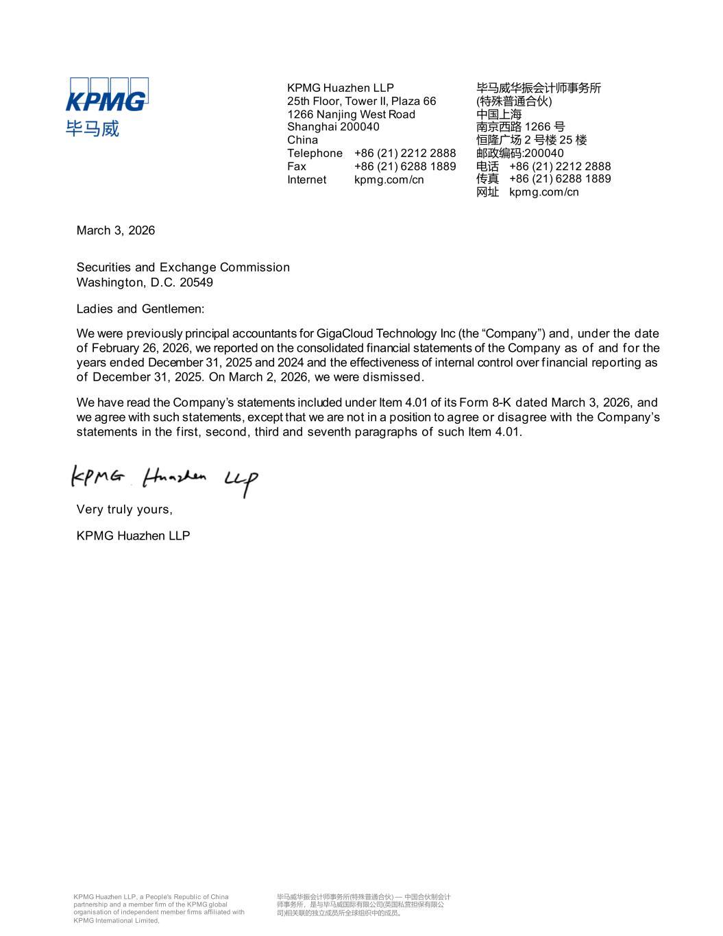 March 3, 2026 Securities and Exchange Commission Washington, D.C. 20549 Ladies and Gentlemen: We were previously principal accountants for GigaCloud Technology Inc (the “Company”) and, under the date of February 26, 2026, we reported on the consolidated financial statements of the Company as of and for the years ended December 31, 2025 and 2024 and the effectiveness of internal control over f inancial reporting as of December 31, 2025. On March 2, 2026, we were dismissed. We have read the Company’s statements included under Item 4.01 of its Form 8-K dated March 3, 2026, and we agree with such statements, except that we are not in a position to agree or disagree with the Company’s statements in the f irst, second, third and seventh paragraphs of such Item 4.01. Very truly yours, KPMG Huazhen LLP KPMG Huazhen LLP 25th Floor, Tower II, Plaza 66 1266 Nanjing West Road Shanghai 200040 China Telephone +86 (21) 2212 2888 Fax +86 (21) 6288 1889 Internet kpmg.com/cn 毕马威华振会计师事务所 (特殊普通合伙) 中国上海 南京西路 1266 号 恒隆广场 2 号楼 25 楼 邮政编码:200040 电话 +86 (21) 2212 2888 传真 +86 (21) 6288 1889 网址 kpmg.com/cn KPMG Huazhen LLP, a People's Republic of China partnership and a member firm of the KPMG global organisation of independent member firms affiliated with KPMG International Limited, 毕马威华振会计师事务所(特殊普通合伙) — 中国合伙制会计 师事务所,是与毕马威国际有限公司(英国私营担保有限公 司)相关联的独立成员所全球组织中的成员。