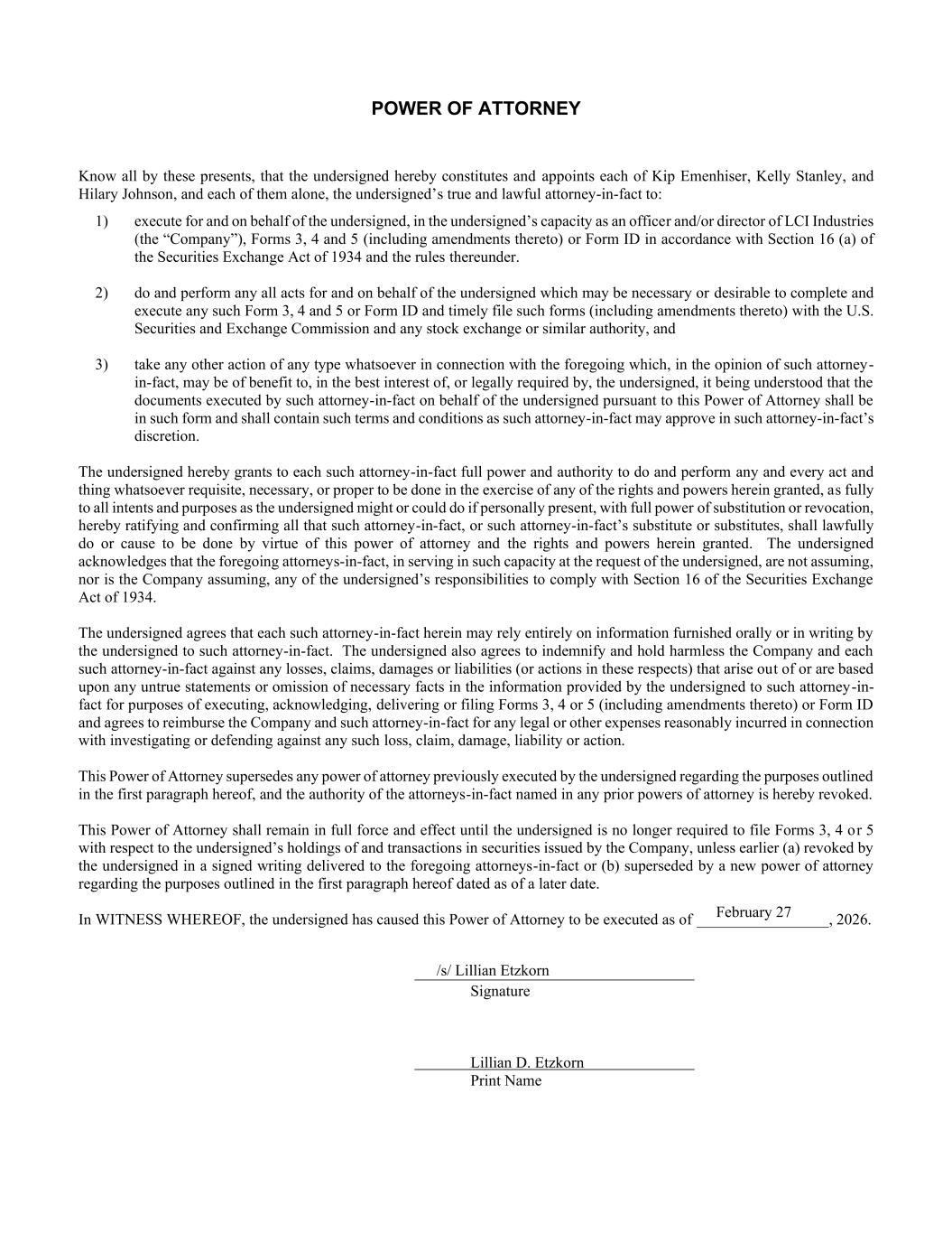 POWER OF ATTORNEY Know all by these presents, that the undersigned hereby constitutes and appoints each of Kip Emenhiser, Kelly Stanley, and Hilary Johnson, and each of them alone, the undersigned’s true and lawful attorney-in-fact to: 1) execute for and on behalf of the undersigned, in the undersigned’s capacity as an officer and/or director of LCI Industries (the “Company”), Forms 3, 4 and 5 (including amendments thereto) or Form ID in accordance with Section 16 (a) of the Securities Exchange Act of 1934 and the rules thereunder. 2) do and perform any all acts for and on behalf of the undersigned which may be necessary or desirable to complete and execute any such Form 3, 4 and 5 or Form ID and timely file such forms (including amendments thereto) with the U.S. Securities and Exchange Commission and any stock exchange or similar authority, and 3) take any other action of any type whatsoever in connection with the foregoing which, in the opinion of such attorney- in-fact, may be of benefit to, in the best interest of, or legally required by, the undersigned, it being understood that the documents executed by such attorney-in-fact on behalf of the undersigned pursuant to this Power of Attorney shall be in such form and shall contain such terms and conditions as such attorney-in-fact may approve in such attorney-in-fact’s discretion. The undersigned hereby grants to each such attorney-in-fact full power and authority to do and perform any and every act and thing whatsoever requisite, necessary, or proper to be done in the exercise of any of the rights and powers herein granted, as fully to all intents and purposes as the undersigned might or could do if personally present, with full power of substitution or revocation, hereby ratifying and confirming all that such attorney-in-fact, or such attorney-in-fact’s substitute or substitutes, shall lawfully do or cause to be done by virtue of this power of attorney and the rights and powers herein granted. The undersigned acknowledges that the foregoing attorneys-in-fact, in serving in such capacity at the request of the undersigned, are not assuming, nor is the Company assuming, any of the undersigned’s responsibilities to comply with Section 16 of the Securities Exchange Act of 1934. The undersigned agrees that each such attorney-in-fact herein may rely entirely on information furnished orally or in writing by the undersigned to such attorney-in-fact. The undersigned also agrees to indemnify and hold harmless the Company and each such attorney-in-fact against any losses, claims, damages or liabilities (or actions in these respects) that arise out of or are based upon any untrue statements or omission of necessary facts in the information provided by the undersigned to such attorney-in- fact for purposes of executing, acknowledging, delivering or filing Forms 3, 4 or 5 (including amendments thereto) or Form ID and agrees to reimburse the Company and such attorney-in-fact for any legal or other expenses reasonably incurred in connection with investigating or defending against any such loss, claim, damage, liability or action. This Power of Attorney supersedes any power of attorney previously executed by the undersigned regarding the purposes outlined in the first paragraph hereof, and the authority of the attorneys-in-fact named in any prior powers of attorney is hereby revoked. This Power of Attorney shall remain in full force and effect until the undersigned is no longer required to file Forms 3, 4 or 5 with respect to the undersigned’s holdings of and transactions in securities issued by the Company, unless earlier (a) revoked by the undersigned in a signed writing delivered to the foregoing attorneys-in-fact or (b) superseded by a new power of attorney regarding the purposes outlined in the first paragraph hereof dated as of a later date. In WITNESS WHEREOF, the undersigned has caused this Power of Attorney to be executed as of _________________, 2026. Signature Lillian D. Etzkorn Print Name February 27 /s/ Lillian Etzkorn
