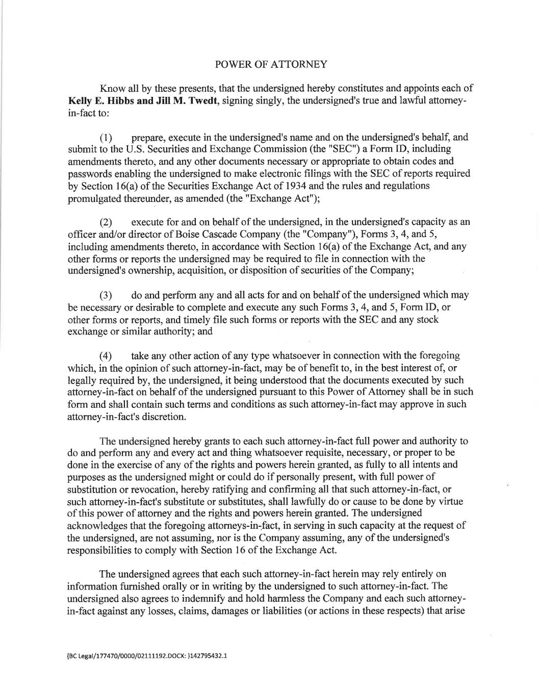 POWER OF ATTORNEY Know all by these presents, that the undersigned hereby constitutes and appoints each of Kelly E. Hibbs and Jill M. Twedt, signing singly, the undersigned's true and lawful attorney- in-fact to: (1) prepare, execute in the undersigned's name and on the undersigned's behalf, and submit to the U.S. Securities and Exchange Commission (the "SEC") a Form ID, including amendments thereto, and any other documents necessary or appropriate to obtain codes and passwords enabling the undersigned to make electronic filings with the SEC of reports required by Section 16(a) of the Securities Exchange Act of 1934 and the rules and regulations promulgated thereunder, as amended (the "Exchange Act"); (2) execute for and on behalf of the undersigned, in the undersigned's capacity as an officer and/or director of Boise Cascade Company (the "Company"), Forms 3, 4, and 5, including amendments thereto, in accordance with Section 16(a) of the Exchange Act, and any other forms or reports the undersigned may be required to file in connection with the undersigned's ownership, acquisition, or disposition of securities of the Company; (3) do and perform any and all acts for and on behalf of the undersigned which may be necessary or desirable to complete and execute any such Forms 3, 4, and 5, Form ID, or other forms or reports, and timely file such forms or reports with the SEC and any stock exchange or similar authority; and (4) take any other action of any type whatsoever in connection with the foregoing which, in the opinion of such attorney-in-fact, may be of benefit to, in the best interest of, or legally required by, the undersigned, it being understood that the documents executed by such attorney-in-fact on behalf of the undersigned pursuant to this Power of Attorney shall be in such form and shall contain such terms and conditions as such attorney-in-fact may approve in such attorney-in-fact's discretion. The undersigned hereby grants to each such attorney-in-fact full power and authority to do and perform any and every act and thing whatsoever requisite, necessary, or proper to be done in the exercise of any of the rights and powers herein granted, as fully to all intents and purposes as the undersigned might or could do if personally present, with full power of substitution or revocation, hereby ratifying and confirming all that such attorney-in-fact, or such attorney-in-fact's substitute or substitutes, shall lawfully do or cause to be done by virtue of this power of attorney and the rights and powers herein granted. The undersigned acknowledges that the foregoing attorneys-in-fact, in serving in such capacity at the request of the undersigned, are not assuming, nor is the Company assuming, any of the undersigned's responsibilities to comply with Section 16 of the Exchange Act. The undersigned agrees that each such attorney-in-fact herein may rely entirely on information furnished orally or in writing by the undersigned to such attorney-in-fact. The undersigned also agrees to indemnify and hold harmless the Company and each such attorney- in-fact against any losses, claims, damages or liabilities (or actions in these respects) that arise {BC Legal/177470/0000/02111192.DOCX: }142795432.1