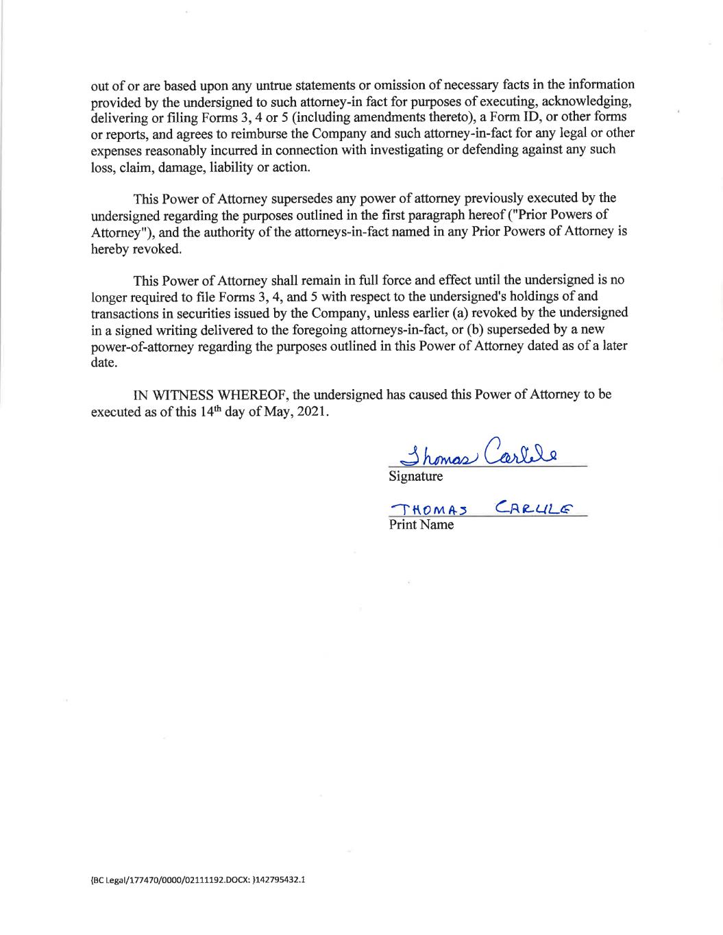 out of or are based upon any untrue statements or omission of necessary facts in the information provided by the undersigned to such attorney-in fact for purposes of executing, acknowledging, delivering or filing Forms 3, 4 or 5 (including amendments thereto), a Form ID, or other forms or reports, and agrees to reimburse the Company and such attorney-in-fact for any legal or other expenses reasonably incurred in connection with investigating or defending against any such loss, claim, damage, liability or action. This Power of Attorney supersedes any power of attorney previously executed by the undersigned regarding the purposes outlined in the first paragraph hereof ("Prior Powers of Attorney"), and the authority of the attorneys-in-fact named in any Prior Powers of Attorney is hereby revoked. This Power of Attorney shall remain in full force and effect until the undersigned is no longer required to file Forms 3, 4, and 5 with respect to the undersigned's holdings of and transactions in securities issued by the Company, unless earlier (a) revoked by the undersigned in a signed writing delivered to the foregoing attorneys-in-fact, or (b) superseded by a new power-of-attorney regarding the purposes outlined in this Power of Attorney dated as of a later date. IN WITNESS WHEREOPF, the undersigned has caused this Power of Attorney to be executed as of this 14" day of May, 2021. Signature THOMAS CRRULE Print Name {BC Legal/177470/0000/02111192.DOCX: }142795432.1