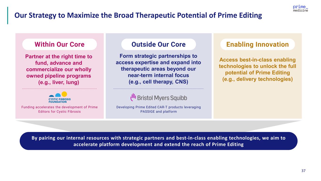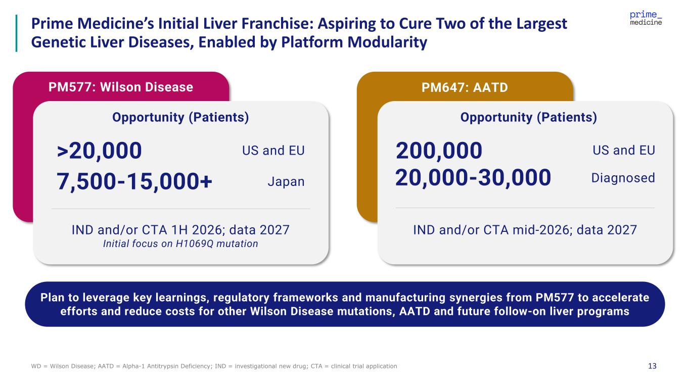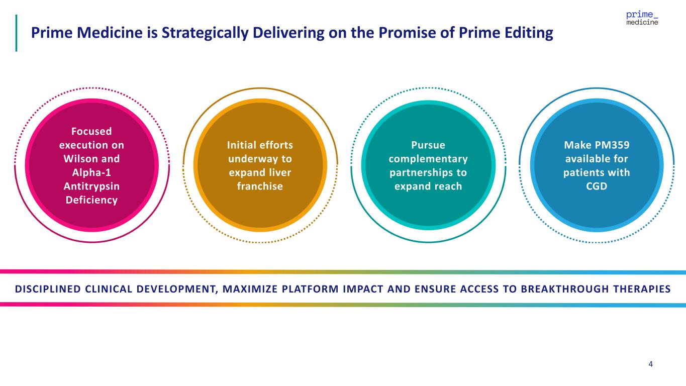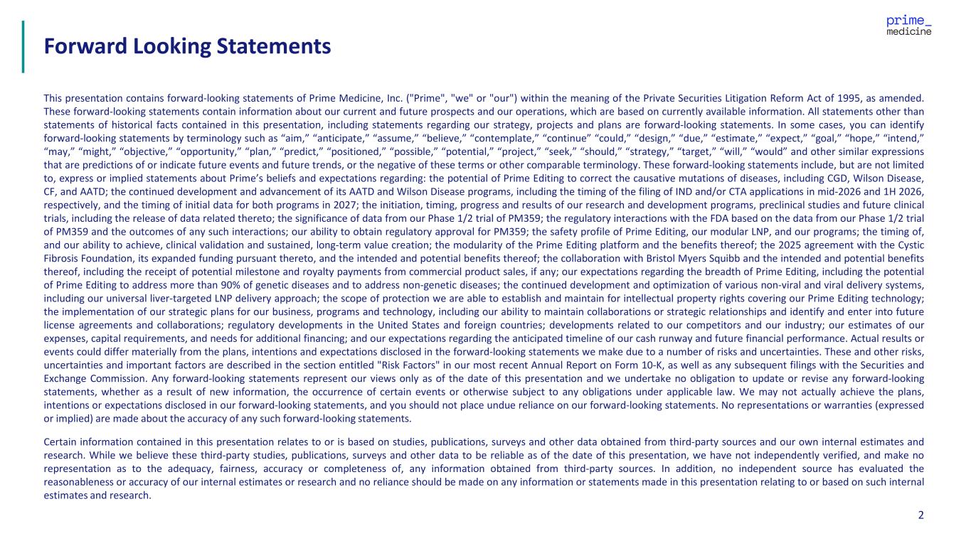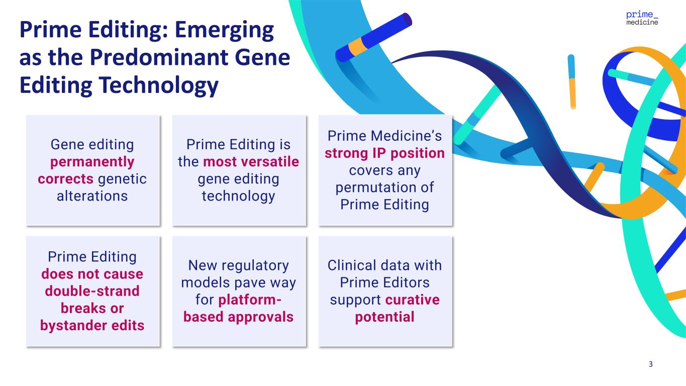 2 This presentation contains forward-looking statements of Prime Medicine, Inc. ("Prime", "we" or "our") within the meaning of the Private Securities Litigation Reform Act of 1995, as amended. These forward-looking statements contain information about our current and future prospects and our operations, which are based on currently available information. All statements other than statements of historical facts contained in this presentation, including statements regarding our strategy, projects and plans are forward-looking statements. In some cases, you can identify forward-looking statements by terminology such as “aim,” “anticipate,” “assume,” “believe,” “contemplate,” “continue” “could,” “design,” “due,” “estimate,” “expect,” “goal,” “hope,” “intend,” “may,” “might,” “objective,” “opportunity,” “plan,” “predict,” “positioned,” “possible,” “potential,” “project,” “seek,” “should,” “strategy,” “target,” “will,” “would” and other similar expressions that are predictions of or indicate future events and future trends, or the negative of these terms or other comparable terminology. These forward-looking statements include, but are not limited to, express or implied statements about Prime’s beliefs and expectations regarding: the potential of Prime Editing to correct the causative mutations of diseases, including CGD, Wilson Disease, CF, and AATD; the continued development and advancement of its AATD and Wilson Disease programs, including the timing of the filing of IND and/or CTA applications in mid-2026 and 1H 2026, respectively, and the timing of initial data for both programs in 2027; the initiation, timing, progress and results of our research and development programs, preclinical studies and future clinical trials, including the release of data related thereto; the significance of data from our Phase 1/2 trial of PM359; the regulatory interactions with the FDA based on the data from our Phase 1/2 trial of PM359 and the outcomes of any such interactions; our ability to obtain regulatory approval for PM359; the safety profile of Prime Editing, our modular LNP, and our programs; the timing of, and our ability to achieve, clinical validation and sustained, long-term value creation; the modularity of the Prime Editing platform and the benefits thereof; the 2025 agreement with the Cystic Fibrosis Foundation, its expanded funding pursuant thereto, and the intended and potential benefits thereof; the collaboration with Bristol Myers Squibb and the intended and potential benefits thereof, including the receipt of potential milestone and royalty payments from commercial product sales, if any; our expectations regarding the breadth of Prime Editing, including the potential of Prime Editing to address more than 90% of genetic diseases and to address non-genetic diseases; the continued development and optimization of various non-viral and viral delivery systems, including our universal liver-targeted LNP delivery approach; the scope of protection we are able to establish and maintain for intellectual property rights covering our Prime Editing technology; the implementation of our strategic plans for our business, programs and technology, including our ability to maintain collaborations or strategic relationships and identify and enter into future license agreements and collaborations; regulatory developments in the United States and foreign countries; developments related to our competitors and our industry; our estimates of our expenses, capital requirements, and needs for additional financing; and our expectations regarding the anticipated timeline of our cash runway and future financial performance. Actual results or events could differ materially from the plans, intentions and expectations disclosed in the forward-looking statements we make due to a number of risks and uncertainties. These and other risks, uncertainties and important factors are described in the section entitled "Risk Factors" in our most recent Annual Report on Form 10-K, as well as any subsequent filings with the Securities and Exchange Commission. Any forward-looking statements represent our views only as of the date of this presentation and we undertake no obligation to update or revise any forward-looking statements, whether as a result of new information, the occurrence of certain events or otherwise subject to any obligations under applicable law. We may not actually achieve the plans, intentions or expectations disclosed in our forward-looking statements, and you should not place undue reliance on our forward-looking statements. No representations or warranties (expressed or implied) are made about the accuracy of any such forward-looking statements. Certain information contained in this presentation relates to or is based on studies, publications, surveys and other data obtained from third-party sources and our own internal estimates and research. While we believe these third-party studies, publications, surveys and other data to be reliable as of the date of this presentation, we have not independently verified, and make no representation as to the adequacy, fairness, accuracy or completeness of, any information obtained from third-party sources. In addition, no independent source has evaluated the reasonableness or accuracy of our internal estimates or research and no reliance should be made on any information or statements made in this presentation relating to or based on such internal estimates and research. Forward Looking Statements