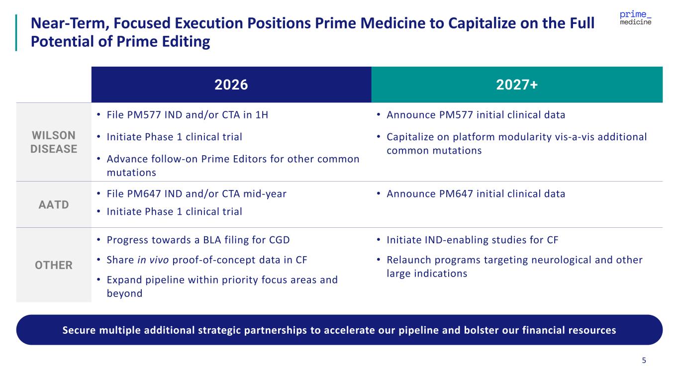 4 Focused execution on Wilson and Alpha-1 Antitrypsin Deficiency Initial efforts underway to expand liver franchise Prime Medicine is Strategically Delivering on the Promise of Prime Editing DISCIPLINED CLINICAL DEVELOPMENT, MAXIMIZE PLATFORM IMPACT AND ENSURE ACCESS TO BREAKTHROUGH THERAPIES Pursue complementary partnerships to expand reach Make PM359 available for patients with CGD
