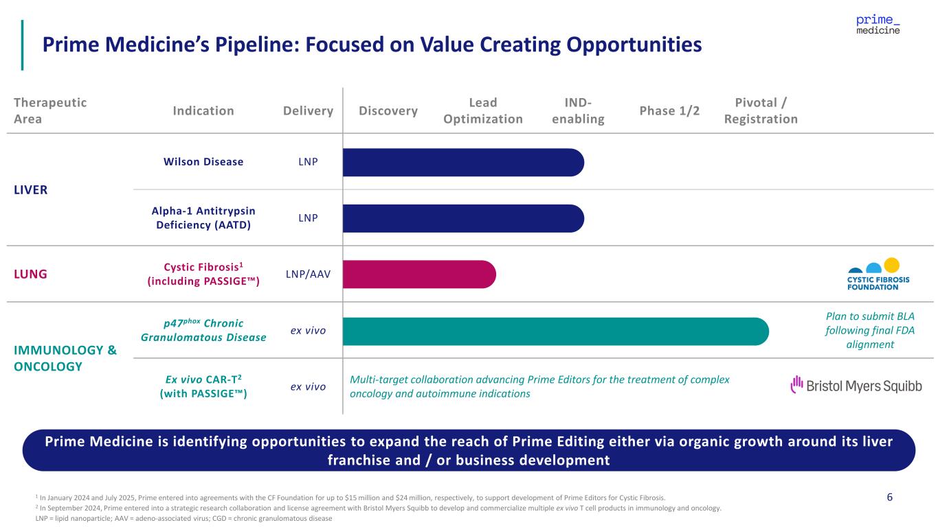 5 Secure multiple additional strategic partnerships to accelerate our pipeline and bolster our financial resources Near-Term, Focused Execution Positions Prime Medicine to Capitalize on the Full Potential of Prime Editing 2026 2027+ WILSON DISEASE • File PM577 IND and/or CTA in 1H • Initiate Phase 1 clinical trial • Advance follow-on Prime Editors for other common mutations • Announce PM577 initial clinical data • Capitalize on platform modularity vis-a-vis additional common mutations AATD • File PM647 IND and/or CTA mid-year • Initiate Phase 1 clinical trial • Announce PM647 initial clinical data OTHER • Progress towards a BLA filing for CGD • Share in vivo proof-of-concept data in CF • Expand pipeline within priority focus areas and beyond • Initiate IND-enabling studies for CF • Relaunch programs targeting neurological and other large indications