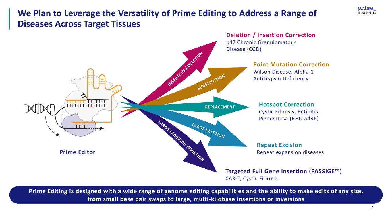 6 Therapeutic Area Indication Delivery Discovery Lead Optimization IND- enabling Phase 1/2 Pivotal / Registration LIVER Wilson Disease LNP Alpha-1 Antitrypsin Deficiency (AATD) LNP LUNG Cystic Fibrosis1 (including PASSIGE ) LNP/AAV IMMUNOLOGY & ONCOLOGY p47phox Chronic Granulomatous Disease ex vivo Plan to submit BLA following final FDA alignment Ex vivo CAR-T2 (with PASSIGE ) ex vivo Multi-target collaboration advancing Prime Editors for the treatment of complex oncology and autoimmune indications 1 In January 2024 and July 2025, Prime entered into agreements with the CF Foundation for up to $15 million and $24 million, respectively, to support development of Prime Editors for Cystic Fibrosis. 2 In September 2024, Prime entered into a strategic research collaboration and license agreement with Bristol Myers Squibb to develop and commercialize multiple ex vivo T cell products in immunology and oncology. LNP = lipid nanoparticle; AAV = adeno-associated virus; CGD = chronic granulomatous disease Prime Medicine’s Pipeline: Focused on Value Creating Opportunities Prime Medicine is identifying opportunities to expand the reach of Prime Editing either via organic growth around its liver franchise and / or business development