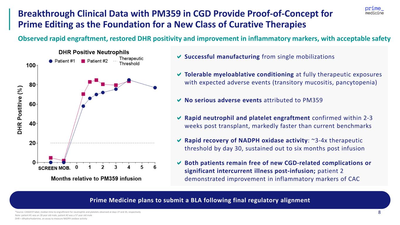 7 We Plan to Leverage the Versatility of Prime Editing to Address a Range of Diseases Across Target Tissues REPLACEMENT Deletion / Insertion Correction p47 Chronic Granulomatous Disease (CGD) Point Mutation Correction Wilson Disease, Alpha-1 Antitrypsin Deficiency Targeted Full Gene Insertion (PASSIGE ) CAR-T, Cystic Fibrosis Repeat Excision Repeat expansion diseases Hotspot Correction Cystic Fibrosis, Retinitis Pigmentosa (RHO adRP) Prime Editor Prime Editing is designed with a wide range of genome editing capabilities and the ability to make edits of any size, from small base pair swaps to large, multi-kilobase insertions or inversions