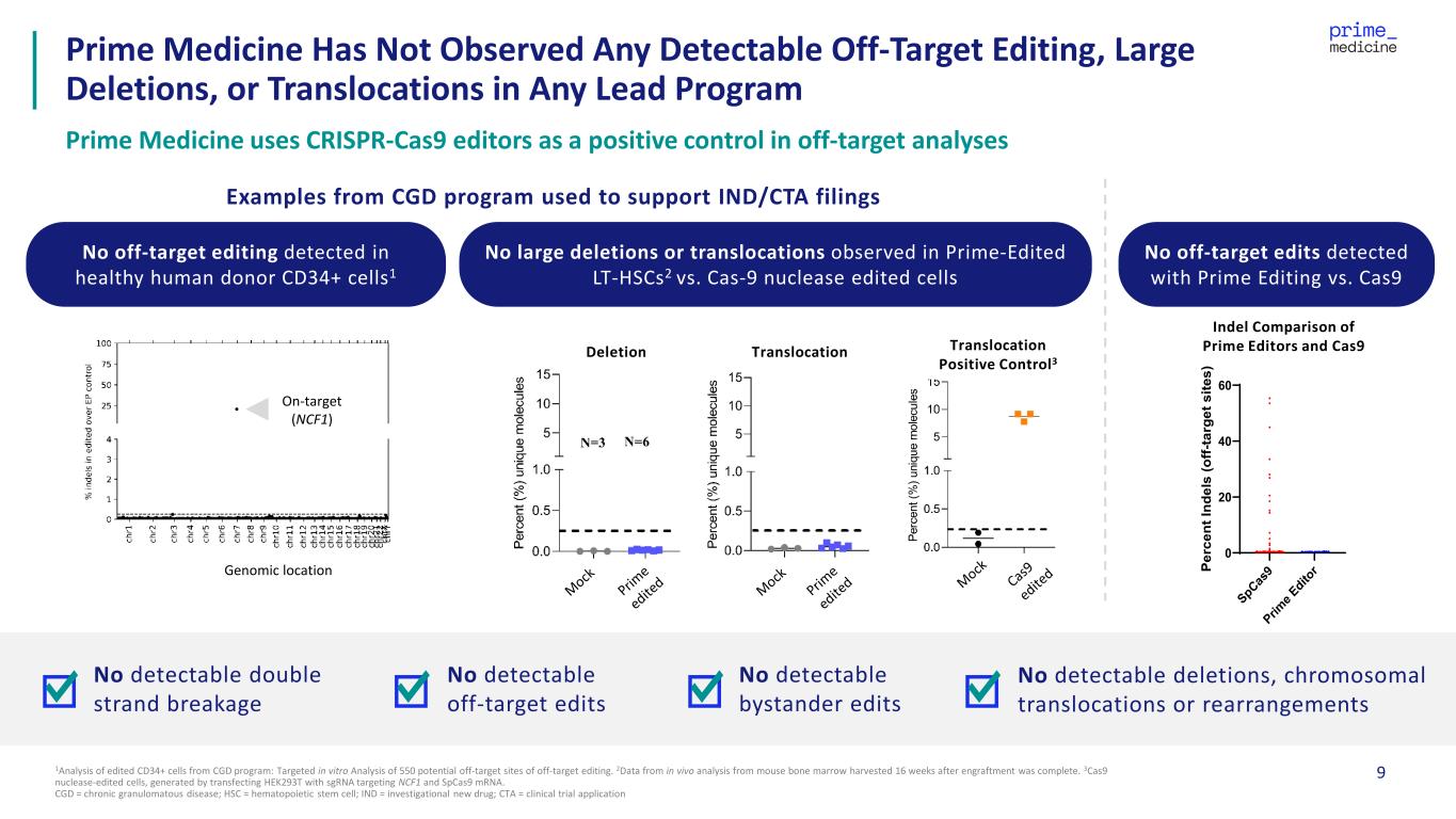 8 Prime Medicine plans to submit a BLA following final regulatory alignment Successful manufacturing from single mobilizations Tolerable myeloablative conditioning at fully therapeutic exposures with expected adverse events (transitory mucositis, pancytopenia) No serious adverse events attributed to PM359 Rapid neutrophil and platelet engraftment confirmed within 2-3 weeks post transplant, markedly faster than current benchmarks Rapid recovery of NADPH oxidase activity: ~3-4x therapeutic threshold by day 30, sustained out to six months post infusion Both patients remain free of new CGD-related complications or significant intercurrent illness post-infusion; patient 2 demonstrated improvement in inflammatory markers of CAC *Source: CASGEVY label, median time to engraftment for neutrophils and platelets observed at days 27 and 35, respectively Note: patient #1 was an 18 year old male, patient #2 was a 57 year old male DHR = dihydrorhodamine, an assay to measure NADPH oxidase activity Breakthrough Clinical Data with PM359 in CGD Provide Proof-of-Concept for Prime Editing as the Foundation for a New Class of Curative Therapies Observed rapid engraftment, restored DHR positivity and improvement in inflammatory markers, with acceptable safety