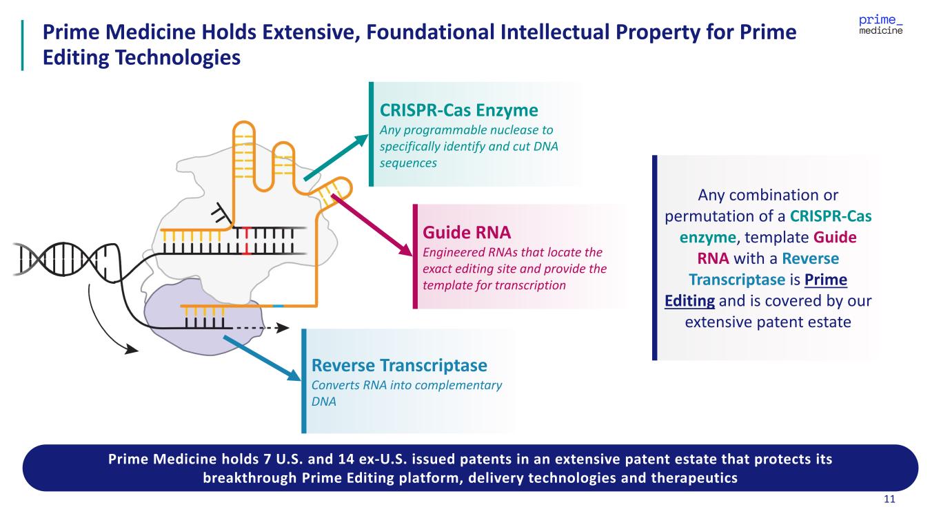 10 Manufacturing Processes and Assays Regulatory Frameworks Clinical Development Consolidated safety and platform clinical trials Computational Design and Screening of Core Components PE proteins, RNAs, lipids Off-Target Analysis to Advance Highest Precision Guide RNAs Non-Clinical Development In-vitro, in-vivo Modular Prime Editing Platform Flywheel Effect: Industrialized Engine is Reused Across Programs LEARN OPTIMIZE REUSE SCALE