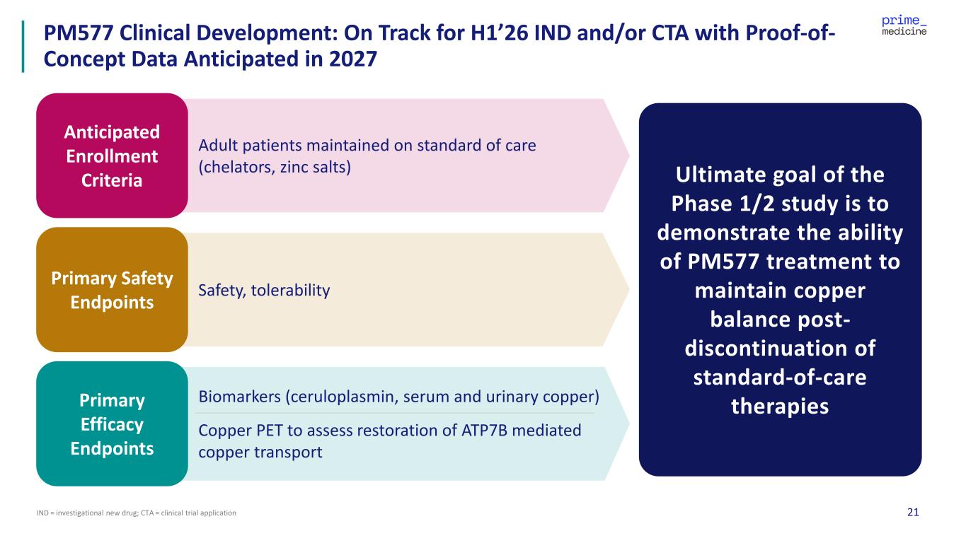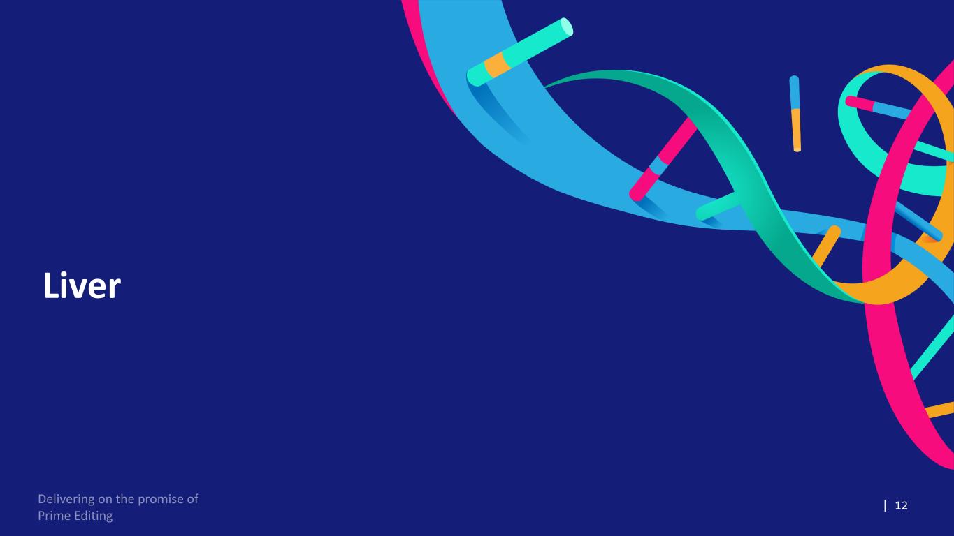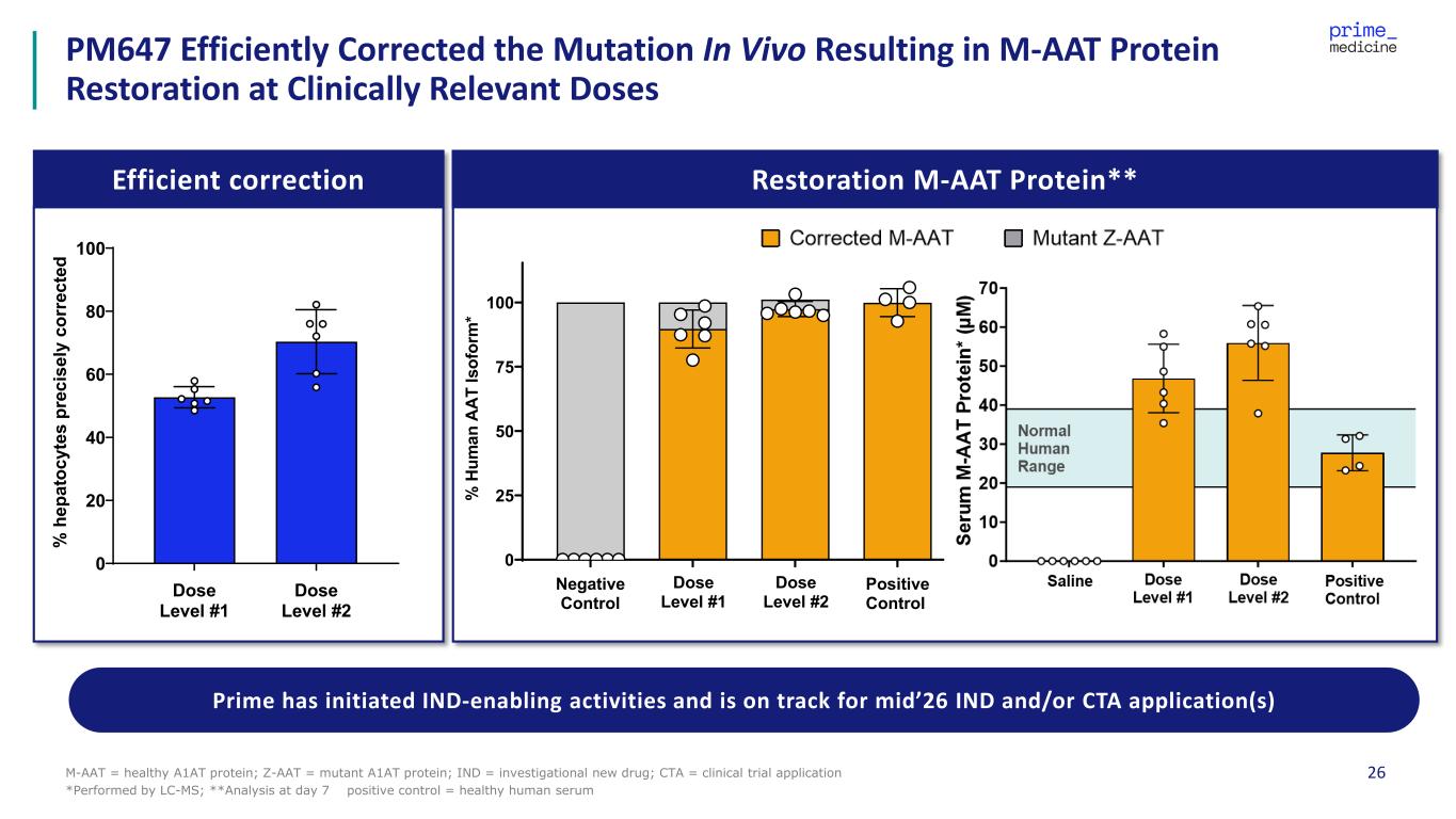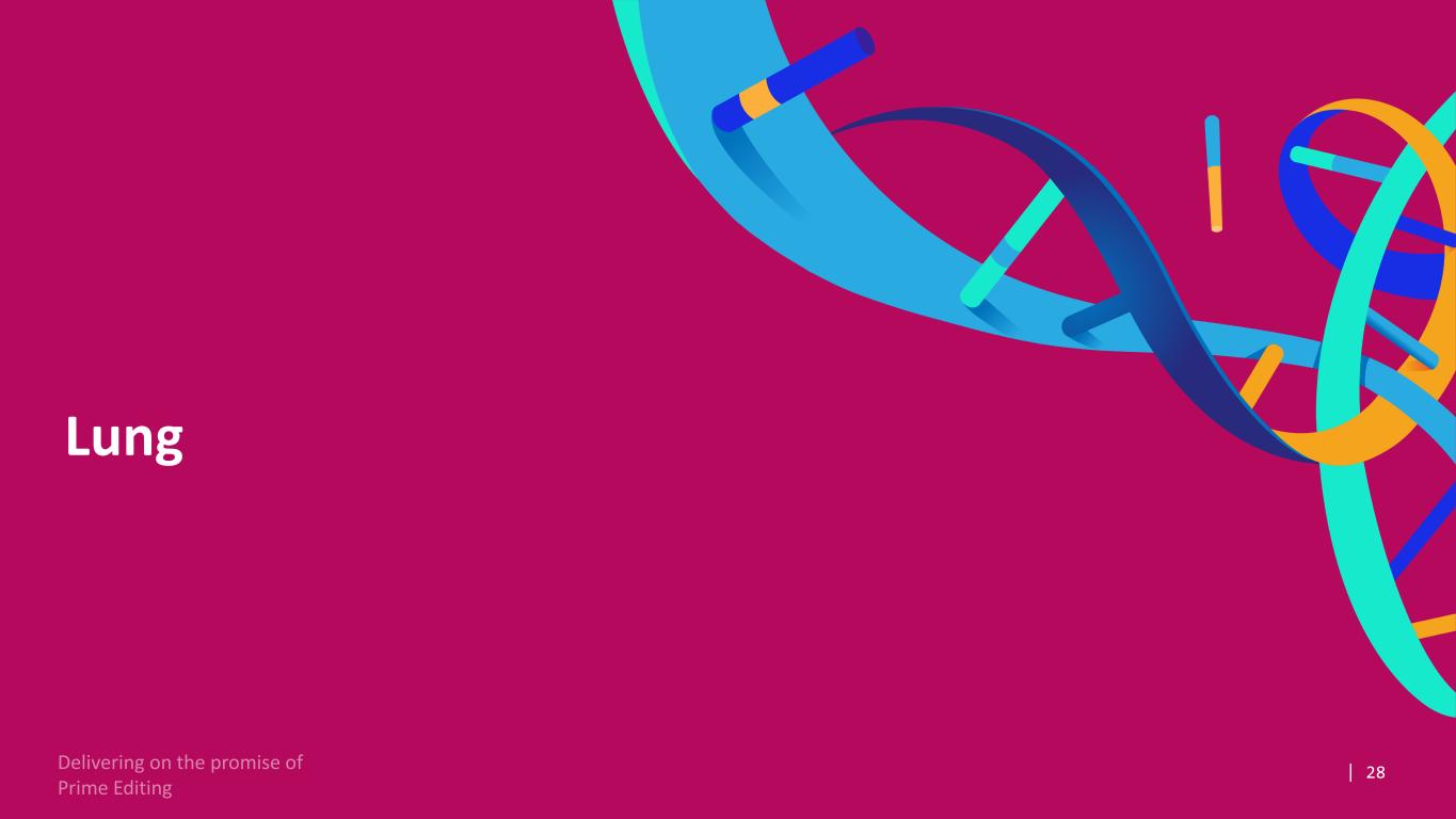26M-AAT = healthy A1AT protein; Z-AAT = mutant A1AT protein; IND = investigational new drug; CTA = clinical trial application *Performed by LC-MS; **Analysis at day 7 positive control = healthy human serum PM647 Efficiently Corrected the Mutation In Vivo Resulting in M-AAT Protein Restoration at Clinically Relevant Doses Efficient correction Restoration M-AAT Protein** 0 20 40 60 80 100 % h ep at oc yt es p re ci se ly c or re ct ed Dose Level #1 Dose Level #2 0 25 50 75 100 % H um an A AT Is of or m * Dose Level #1 Positive Control Dose Level #2 Negative Control Prime has initiated IND-enabling activities and is on track for mid’26 IND and/or CTA application(s)