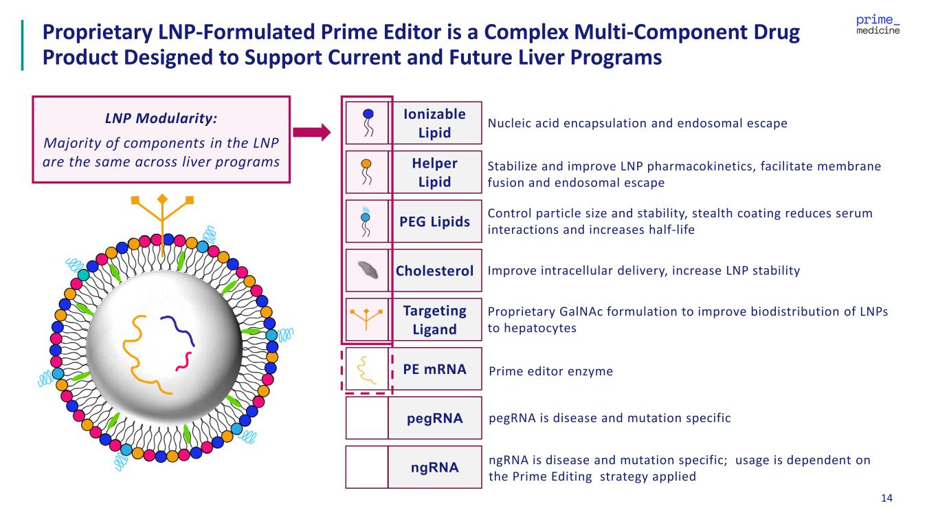 13 PM647: AATD Prime Medicine’s Initial Liver Franchise: Aspiring to Cure Two of the Largest Genetic Liver Diseases, Enabled by Platform Modularity WD = Wilson Disease; AATD = Alpha-1 Antitrypsin Deficiency; IND = investigational new drug; CTA = clinical trial application PM577: Wilson Disease >20,000 7,500-15,000+ US and EU Japan IND and/or CTA 1H 2026; data 2027 Initial focus on H1069Q mutation Plan to leverage key learnings, regulatory frameworks and manufacturing synergies from PM577 to accelerate efforts and reduce costs for other Wilson Disease mutations, AATD and future follow-on liver programs 200,000 US and EU 20,000-30,000 Diagnosed IND and/or CTA mid-2026; data 2027 Opportunity (Patients) Opportunity (Patients)
