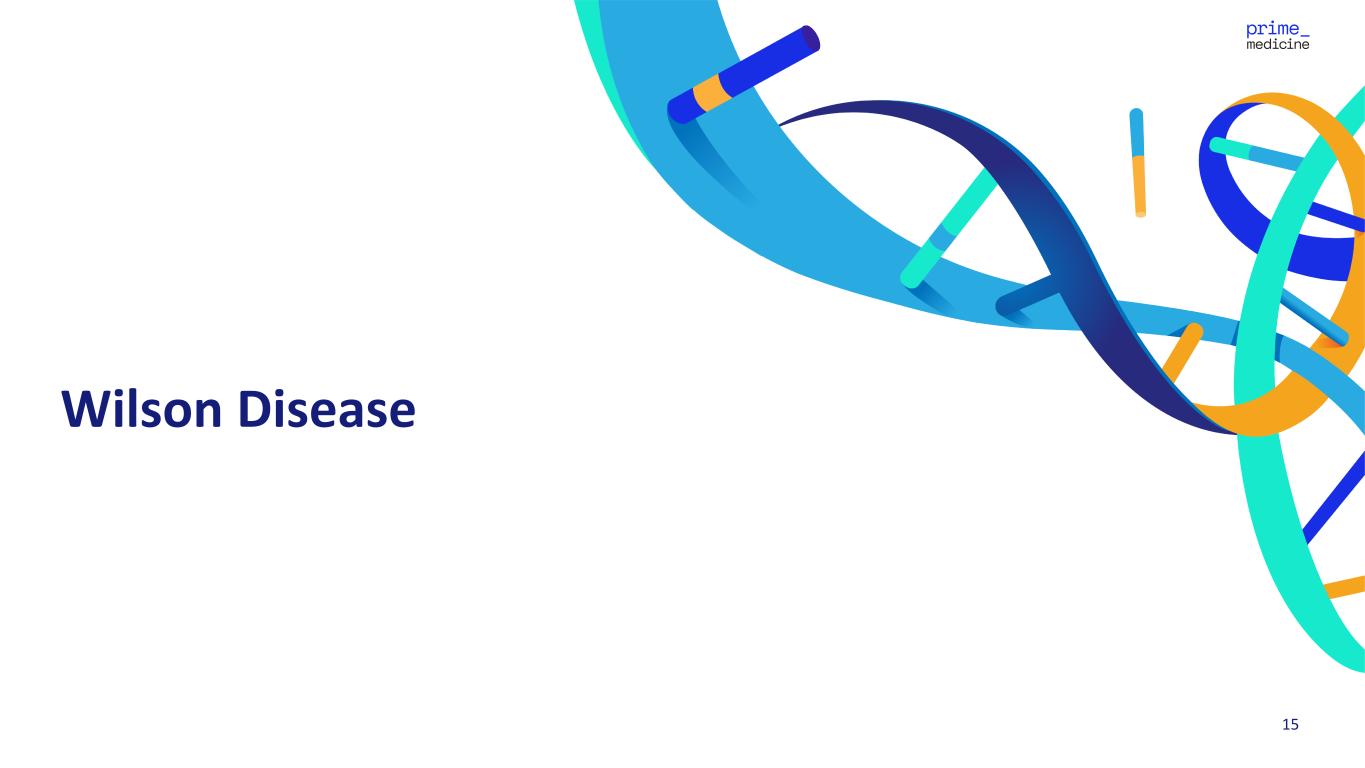 14 Proprietary LNP-Formulated Prime Editor is a Complex Multi-Component Drug Product Designed to Support Current and Future Liver Programs Control particle size and stability, stealth coating reduces serum interactions and increases half-lifePEG Lipids Stabilize and improve LNP pharmacokinetics, facilitate membrane fusion and endosomal escape Helper Lipid Improve intracellular delivery, increase LNP stabilityCholesterol Proprietary GalNAc formulation to improve biodistribution of LNPs to hepatocytes Targeting Ligand LNP Modularity: Majority of components in the LNP are the same across liver programs Ionizable Lipid Nucleic acid encapsulation and endosomal escape pegRNA is disease and mutation specificpegRNA ngRNA ngRNA is disease and mutation specific; usage is dependent on the Prime Editing strategy applied Prime editor enzymePE mRNA