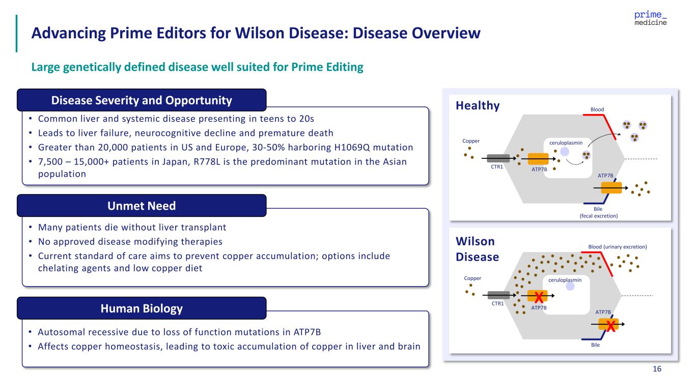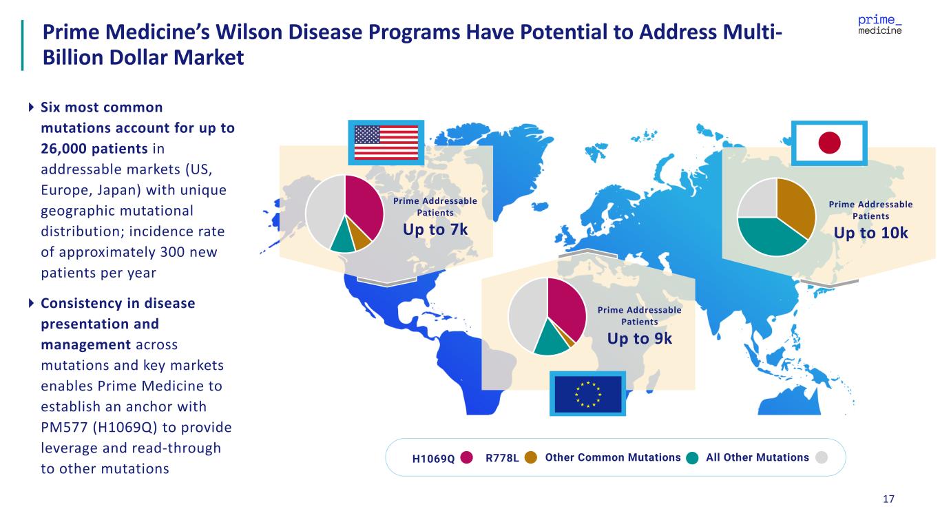 16 Wilson Disease Advancing Prime Editors for Wilson Disease: Disease Overview Large genetically defined disease well suited for Prime Editing ceruloplasmin Blood Bile (fecal excretion) ATP7B ATP7B Copper CTR1 ceruloplasmin Blood (urinary excretion) Bile ATP7B ATP7B Copper CTR1 X X Healthy • Common liver and systemic disease presenting in teens to 20s • Leads to liver failure, neurocognitive decline and premature death • Greater than 20,000 patients in US and Europe, 30-50% harboring H1069Q mutation • 7,500 – 15,000+ patients in Japan, R778L is the predominant mutation in the Asian population Disease Severity and Opportunity • Many patients die without liver transplant • No approved disease modifying therapies • Current standard of care aims to prevent copper accumulation; options include chelating agents and low copper diet Unmet Need • Autosomal recessive due to loss of function mutations in ATP7B • Affects copper homeostasis, leading to toxic accumulation of copper in liver and brain Human Biology