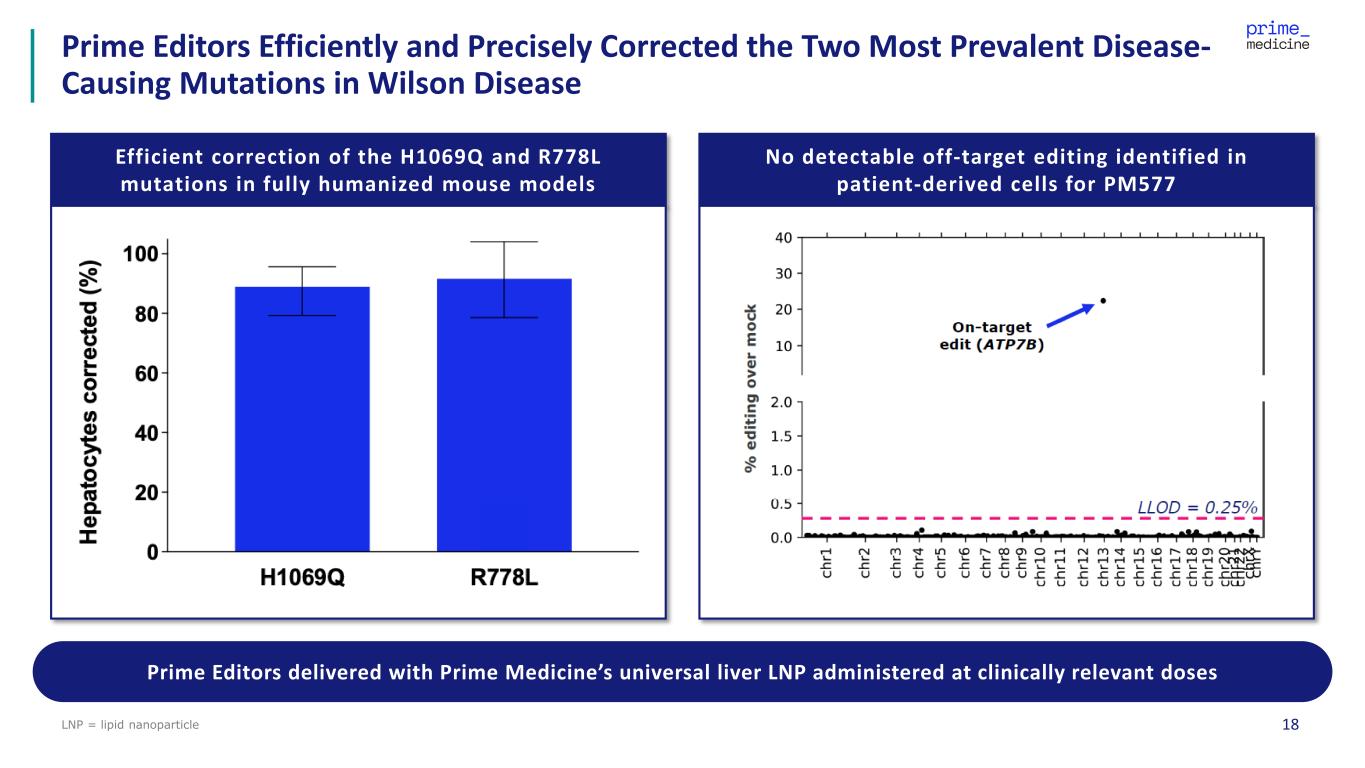 17 Prime Medicine’s Wilson Disease Programs Have Potential to Address Multi- Billion Dollar Market H1069Q R778L Other Common Mutations All Other Mutations Prime Addressable Patients Up to 7k Six most common mutations account for up to 26,000 patients in addressable markets (US, Europe, Japan) with unique geographic mutational distribution; incidence rate of approximately 300 new patients per year Consistency in disease presentation and management across mutations and key markets enables Prime Medicine to establish an anchor with PM577 (H1069Q) to provide leverage and read-through to other mutations Prime Addressable Patients Up to 9k Prime Addressable Patients Up to 10k