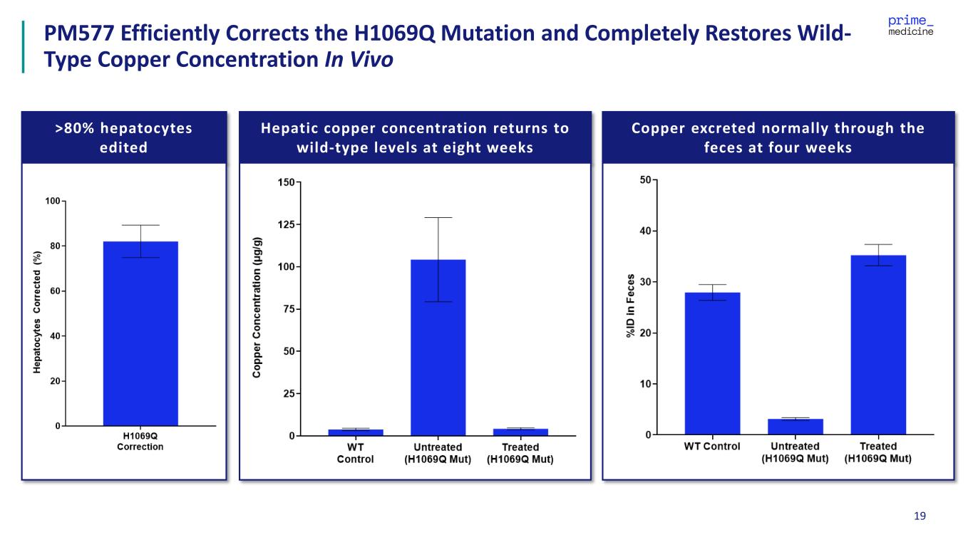 18 Efficient correction of the H1069Q and R778L mutations in fully humanized mouse models Prime Editors Efficiently and Precisely Corrected the Two Most Prevalent Disease- Causing Mutations in Wilson Disease No detectable off-target editing identified in patient-derived cells for PM577 LNP = lipid nanoparticle Prime Editors delivered with Prime Medicine’s universal liver LNP administered at clinically relevant doses