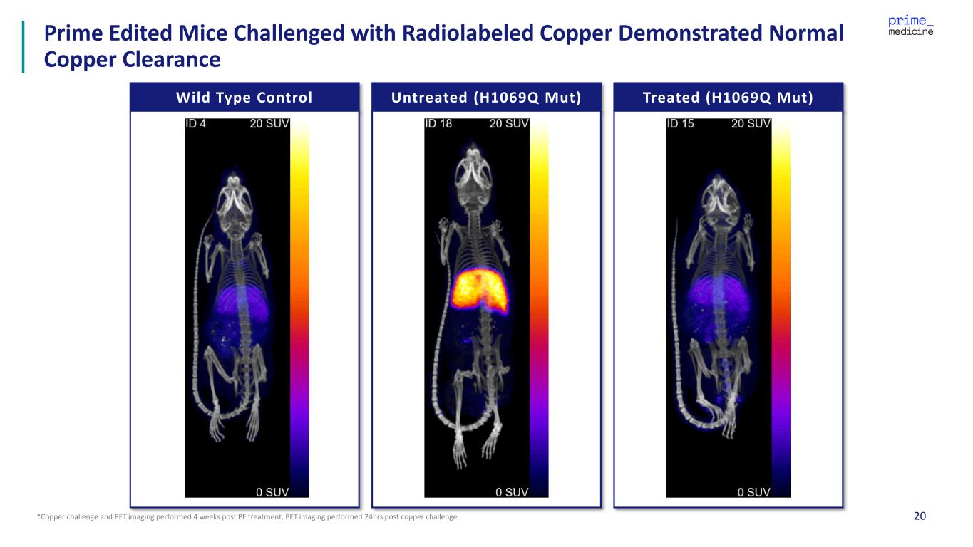20*Copper challenge and PET imaging performed 4 weeks post PE treatment, PET imaging performed 24hrs post copper challenge Prime Edited Mice Challenged with Radiolabeled Copper Demonstrated Normal Copper Clearance Treated (H1069Q Mut)Wild Type Control Untreated (H1069Q Mut)