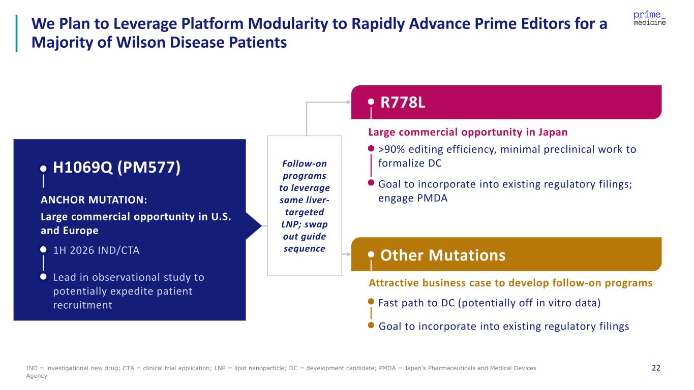21IND = investigational new drug; CTA = clinical trial application PM577 Clinical Development: On Track for H1’26 IND and/or CTA with Proof-of- Concept Data Anticipated in 2027 Anticipated Enrollment Criteria Primary Safety Endpoints Primary Efficacy Endpoints Adult patients maintained on standard of care (chelators, zinc salts) Safety, tolerability Biomarkers (ceruloplasmin, serum and urinary copper) Copper PET to assess restoration of ATP7B mediated copper transport Ultimate goal of the Phase 1/2 study is to demonstrate the ability of PM577 treatment to maintain copper balance post- discontinuation of standard-of-care therapies
